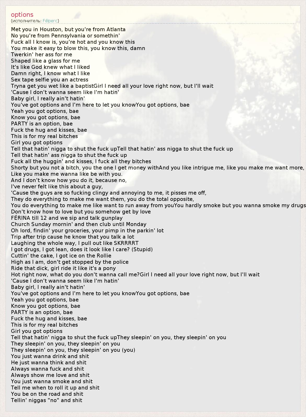 Met you in Houston, but you're from Atlanta No you're from Pennsylvania or somethin' Fuck all I know is, you're hot and you know this You make it easy to blow this, you know this, damn Twerkin' her ass for me Shaped like a glass for me It's like God knew what I liked Damn right, I know what I like Sex tape selfie you an actress Tryna get you wet like a baptistGirl I need all your love right now, but I'll wait 'Cause I don't wanna seem like I'm hatin' Baby girl, I really ain't hatin' You've got options and I'm here to let you knowYou got options, bae Yeah you got options, bae Know you got options, bae PARTY is an option, bae Fuck the hug and kisses, bae This is for my real bitches Girl you got options Tell that hatin' nigga to shut the fuck upTell that hatin' ass nigga to shut the fuck up Tell that hatin' ass nigga to shut the fuck up Fuck all the huggin' and kisses, I fuck all they bitches Shorty but you not a bitch, you the one I get money withAnd you like intrigue me, like you make me want more, Like you make me wanna like be with you. And I don't know how you do it, because no, I've never felt like this about a guy, 'Cause the guys are so fucking clingy and annoying to me, it pisses me off, They do everything to make me want them, you do the total opposite, You do everything to make me like want to run away from youYou hardly smoke but you wanna smoke my drugs Don't know how to love but you somehow get by love FÉRINA till 12 and we sip and talk gunplay Church Sunday mornin' and then club until Monday Oh lord, findin' your groceries, your pimp in the parkin' lot Trip after trip cause he know that you talk a lot Laughing the whole way, I pull out like SKRRRRT I got drugs, I got lean, does it look like I care? (Stupid) Cuttin' the cake, I got ice on the Rollie High as I am, don't get stopped by the police Ride that dick, girl ride it like it's a pony Hot right now, what do you don't wanna call me?Girl I need all your love right now, but I'll wait 'Cause I don't wanna seem like I'm hatin' Baby girl, I really ain't hatin' You've got options and I'm here to let you knowYou got options, bae Yeah you got options, bae Know you got options, bae PARTY is an option, bae Fuck the hug and kisses, bae This is for my real bitches Girl you got options Tell that hatin' nigga to shut the fuck upThey sleepin' on you, they sleepin' on you They sleepin' on you, they sleepin' on you They sleepin' on you, they sleepin' on you (you) You just wanna drink and shit He just wanna think and shit Always wanna fuck and shit Always show me love and shit You just wanna smoke and shit Tell me when to roll it up and shit You be on the road and shit Tellin' niggas "no" and shit