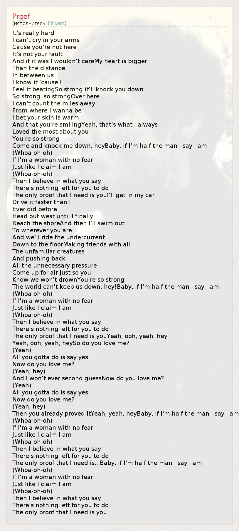 It's really hard I can't cry in your arms Cause you're not here It's not your fault And if it was I wouldn't careMy heart is bigger Than the distance In between us I know it 'cause I Feel it beatingSo strong it'll knock you down So strong, so strongOver here I can't count the miles away From where I wanna be I bet your skin is warm And that you're smilingYeah, that's what I always Loved the most about you You're so strong Come and knock me down, heyBaby, if I'm half the man I say I am (Whoa-oh-oh) If I'm a woman with no fear Just like I claim I am (Whoa-oh-oh) Then I believe in what you say There's nothing left for you to do The only proof that I need is youI'll get in my car Drive it faster than I Ever did before Head out west until I finally Reach the shoreAnd then I'll swim out To wherever you are And we'll ride the undercurrent Down to the floorMaking friends with all The unfamiliar creatures And pushing back All the unnecessary pressure Come up for air just so you Know we won't drownYou're so strong The world can't keep us down, hey!Baby, if I'm half the man I say I am (Whoa-oh-oh) If I'm a woman with no fear Just like I claim I am (Whoa-oh-oh) Then I believe in what you say There's nothing left for you to do The only proof that I need is youYeah, ooh, yeah, hey Yeah, ooh, yeah, heySo do you love me? (Yeah) All you gotta do is say yes Now do you love me? (Yeah, hey) And I won't ever second guessNow do you love me? (Yeah) All you gotta do is say yes Now do you love me? (Yeah, hey) Then you already proved itYeah, yeah, heyBaby, if I'm half the man I say I am (Whoa-oh-oh) If I'm a woman with no fear Just like I claim I am (Whoa-oh-oh) Then I believe in what you say There's nothing left for you to do The only proof that I need is...Baby, if I'm half the man I say I am (Whoa-oh-oh) If I'm a woman with no fear Just like I claim I am (Whoa-oh-oh) Then I believe in what you say There's nothing left for you to do The only proof that I need is you