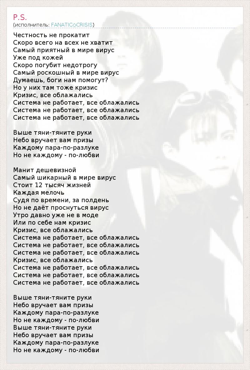 Честность не прокатит Скоро всего на всех не хватит Самый приятный в мире вирус Уже под кожей Скоро погубит недотрогу Самый роскошный в мире вирус Думаешь, боги нам помогут? Но у них там тоже кризис Кризис, все облажались Система не работает, все облажались Система не работает, все облажались Система не работает, все облажались Выше тяни-тяните руки Небо вручает вам призы Каждому пара-по-разлуке Но не каждому - по-любви Манит дешевизной Самый шикарный в мире вирус Стоит 12 тысяч жизней Каждая мелочь Судя по времени, за полдень Но не даёт проснуться вирус Утро давно уже не в моде Или по себе нам кризис Кризис, все облажались Система не работает, все облажались Система не работает, все облажались Система не работает, все облажались Кризис, все облажались Система не работает, все облажались Система не работает, все облажались Система не работает, все облажались Выше тяни-тяните руки Небо вручает вам призы Каждому пара-по-разлуке Но не каждому - по-любви Выше тяни-тяните руки Небо вручает вам призы Каждому пара-по-разлуке Но не каждому - по-любви