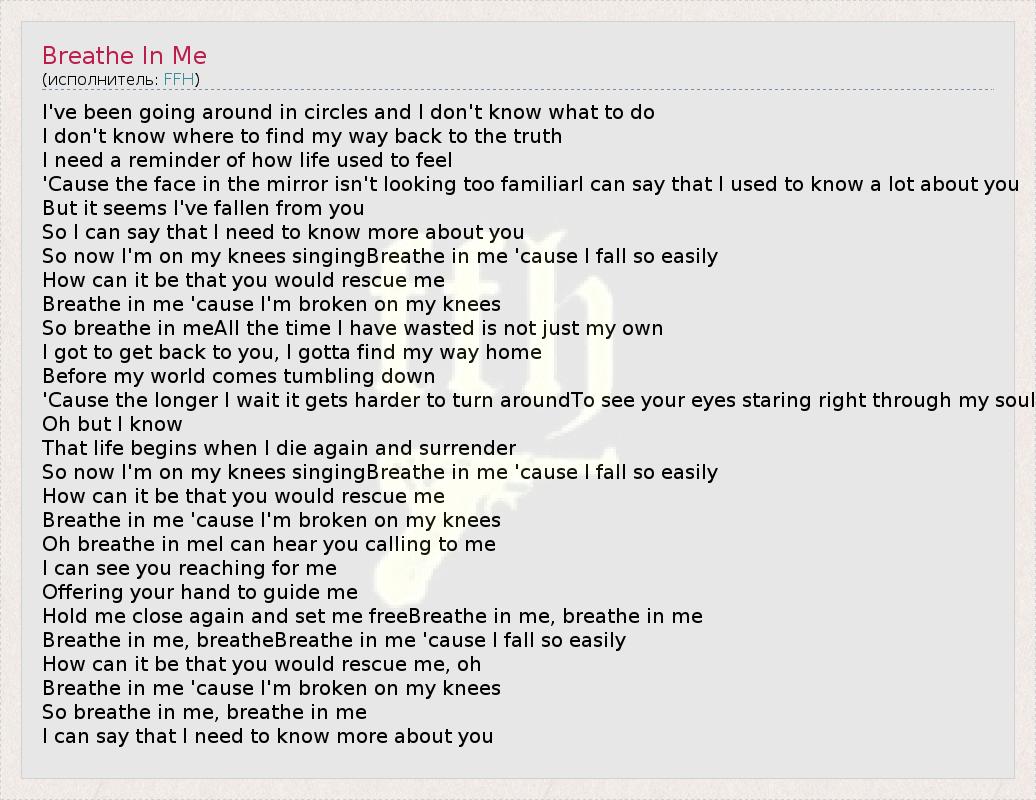 I've been going around in circles and I don't know what to do I don't know where to find my way back to the truth I need a reminder of how life used to feel 'Cause the face in the mirror isn't looking too familiarI can say that I used to know a lot about you But it seems I've fallen from you So I can say that I need to know more about you So now I'm on my knees singingBreathe in me 'cause I fall so easily How can it be that you would rescue me Breathe in me 'cause I'm broken on my knees So breathe in meAll the time I have wasted is not just my own I got to get back to you, I gotta find my way home Before my world comes tumbling down 'Cause the longer I wait it gets harder to turn aroundTo see your eyes staring right through my soul Oh but I know That life begins when I die again and surrender So now I'm on my knees singingBreathe in me 'cause I fall so easily How can it be that you would rescue me Breathe in me 'cause I'm broken on my knees Oh breathe in meI can hear you calling to me I can see you reaching for me Offering your hand to guide me Hold me close again and set me freeBreathe in me, breathe in me Breathe in me, breatheBreathe in me 'cause I fall so easily How can it be that you would rescue me, oh Breathe in me 'cause I'm broken on my knees So breathe in me, breathe in me I can say that I need to know more about you