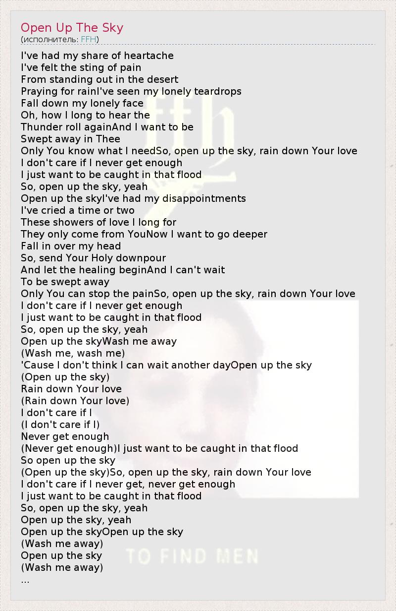 I've had my share of heartache I've felt the sting of pain From standing out in the desert Praying for rainI've seen my lonely teardrops Fall down my lonely face Oh, how I long to hear the Thunder roll againAnd I want to be Swept away in Thee Only You know what I needSo, open up the sky, rain down Your love I don't care if I never get enough I just want to be caught in that flood So, open up the sky, yeah Open up the skyI've had my disappointments I've cried a time or two These showers of love I long for They only come from YouNow I want to go deeper Fall in over my head So, send Your Holy downpour And let the healing beginAnd I can't wait To be swept away Only You can stop the painSo, open up the sky, rain down Your love I don't care if I never get enough I just want to be caught in that flood So, open up the sky, yeah Open up the skyWash me away (Wash me, wash me) 'Cause I don't think I can wait another dayOpen up the sky (Open up the sky) Rain down Your love (Rain down Your love) I don't care if I (I don't care if I) Never get enough (Never get enough)I just want to be caught in that flood So open up the sky (Open up the sky)So, open up the sky, rain down Your love I don't care if I never get, never get enough I just want to be caught in that flood So, open up the sky, yeah Open up the sky, yeah Open up the skyOpen up the sky (Wash me away) Open up the sky (Wash me away) ...