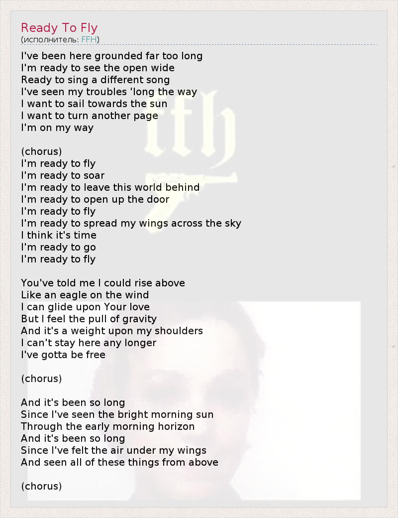 I've been here grounded far too long I'm ready to see the open wide Ready to sing a different song I've seen my troubles 'long the way I want to sail towards the sun I want to turn another page I'm on my way (chorus) I'm ready to fly I'm ready to soar I'm ready to leave this world behind I'm ready to open up the door I'm ready to fly I'm ready to spread my wings across the sky I think it's time I'm ready to go I'm ready to fly You've told me I could rise above Like an eagle on the wind I can glide upon Your love But I feel the pull of gravity And it's a weight upon my shoulders I can't stay here any longer I've gotta be free (chorus) And it's been so long Since I've seen the bright morning sun Through the early morning horizon And it's been so long Since I've felt the air under my wings And seen all of these things from above (chorus)