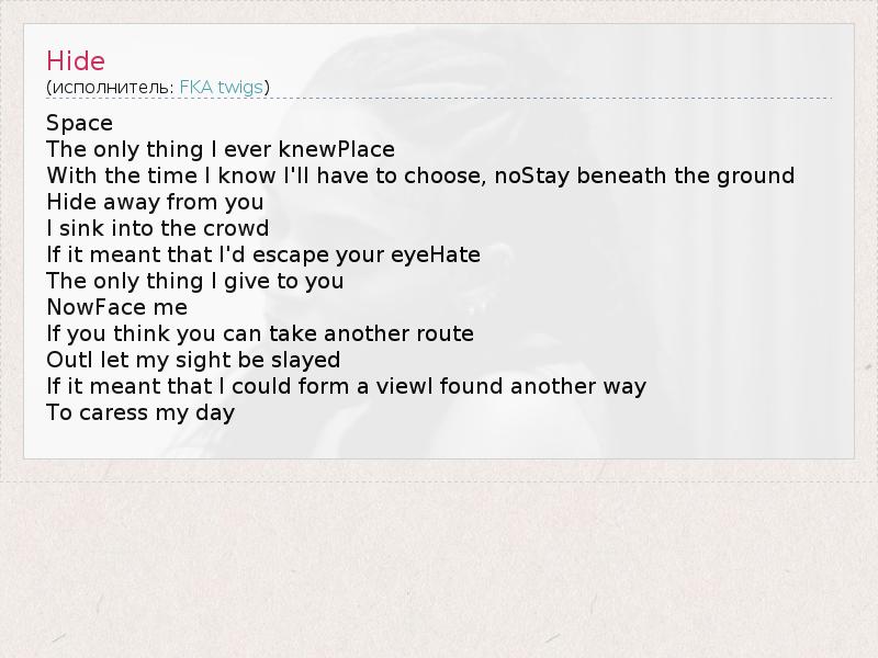 Это интересно:Авант-поп-певица из Великобритании выложила в свой tumblr всего две видеозаписи, но уже угодила на обложку i-D. Потусторонний R&B, дрожащий бас, пустотные пространства как у Джеймса Блейка, загадочный вокал и напряженная атмосфера — вот, пожалуй, основные составляющие ее музыки. Таинственную сущность своего творчества певица подчеркивает уже традиционным для представителей современного... продолжение
