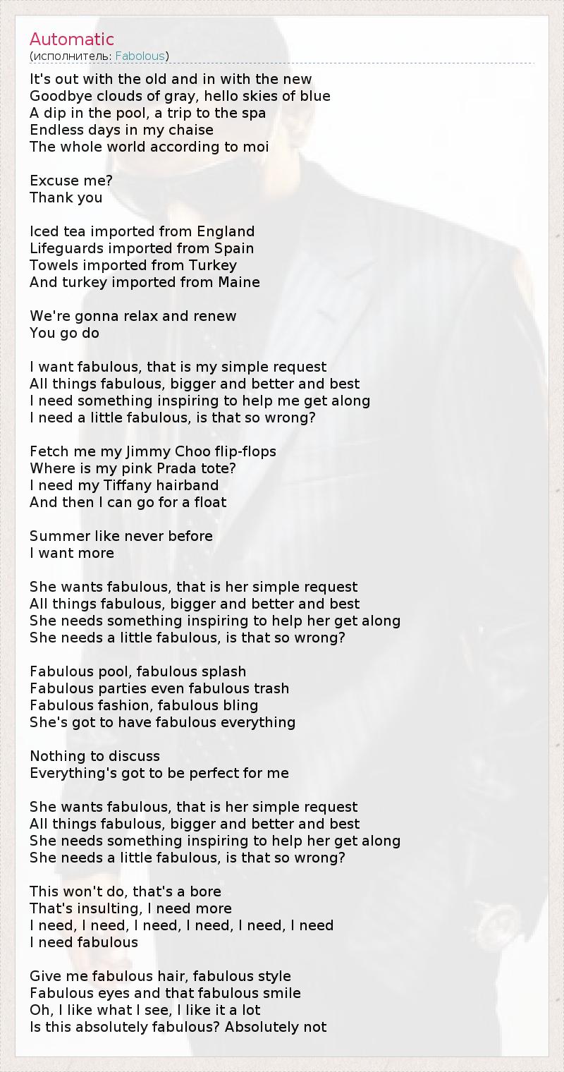 It's out with the old and in with the new Goodbye clouds of gray, hello skies of blue A dip in the pool, a trip to the spa Endless days in my chaise The whole world according to moi Excuse me? Thank you Iced tea imported from England Lifeguards imported from Spain Towels imported from Turkey And turkey imported from Maine We're gonna relax and renew You go do I want fabulous, that is my simple request All things fabulous, bigger and better and best I need something inspiring to help me get along I need a little fabulous, is that so wrong? Fetch me my Jimmy Choo flip-flops Where is my pink Prada tote? I need my Tiffany hairband And then I can go for a float Summer like never before I want more She wants fabulous, that is her simple request All things fabulous, bigger and better and best She needs something inspiring to help her get along She needs a little fabulous, is that so wrong? Fabulous pool, fabulous splash Fabulous parties even fabulous trash Fabulous fashion, fabulous bling She's got to have fabulous everything Nothing to discuss Everything's got to be perfect for me She wants fabulous, that is her simple request All things fabulous, bigger and better and best She needs something inspiring to help her get along She needs a little fabulous, is that so wrong? This won't do, that's a bore That's insulting, I need more I need, I need, I need, I need, I need, I need I need fabulous Give me fabulous hair, fabulous style Fabulous eyes and that fabulous smile Oh, I like what I see, I like it a lot Is this absolutely fabulous? Absolutely not