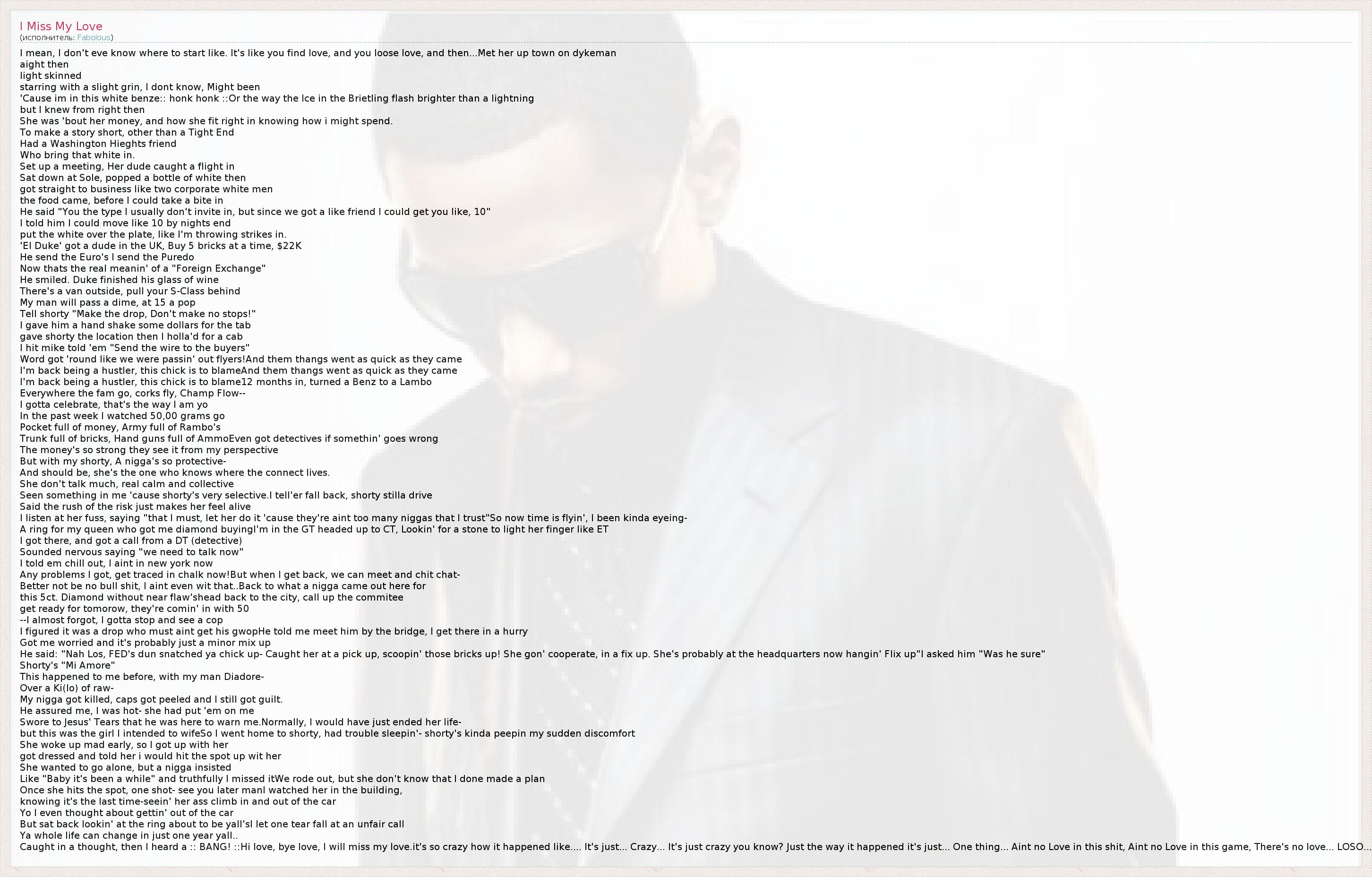 Caught in a thought, then I heard a :: BANG! ::Hi love, bye love, I will miss my love.it's so crazy how it happened like.... It's just... Crazy... It's just crazy you know? Just the way it happened it's just... One thing... Aint no Love in this shit, Aint no Love in this game, There's no love... LOSO...