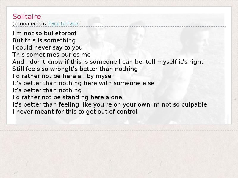I'm not so bulletproof But this is something I could never say to you This sometimes buries me And I don't know if this is someone I can beI tell myself it's right Still feels so wrongIt's better than nothing I'd rather not be here all by myself It's better than nothing here with someone else It's better than nothing I'd rather not be standing here alone It's better than feeling like you're on your ownI'm not so culpable I never meant for this to get out of control