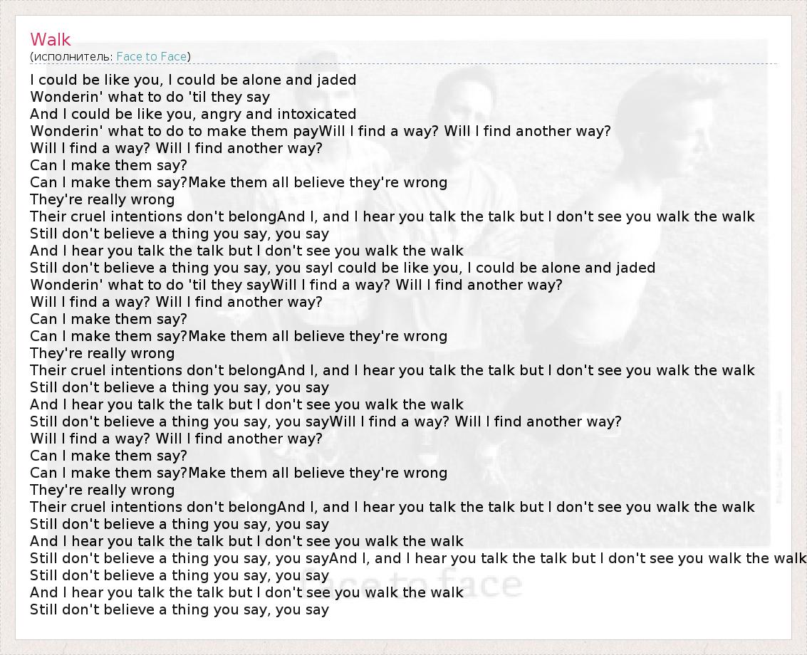I could be like you, I could be alone and jaded Wonderin' what to do 'til they say And I could be like you, angry and intoxicated Wonderin' what to do to make them payWill I find a way? Will I find another way? Will I find a way? Will I find another way? Can I make them say? Can I make them say?Make them all believe they're wrong They're really wrong Their cruel intentions don't belongAnd I, and I hear you talk the talk but I don't see you walk the walk Still don't believe a thing you say, you say And I hear you talk the talk but I don't see you walk the walk Still don't believe a thing you say, you sayI could be like you, I could be alone and jaded Wonderin' what to do 'til they sayWill I find a way? Will I find another way? Will I find a way? Will I find another way? Can I make them say? Can I make them say?Make them all believe they're wrong They're really wrong Their cruel intentions don't belongAnd I, and I hear you talk the talk but I don't see you walk the walk Still don't believe a thing you say, you say And I hear you talk the talk but I don't see you walk the walk Still don't believe a thing you say, you sayWill I find a way? Will I find another way? Will I find a way? Will I find another way? Can I make them say? Can I make them say?Make them all believe they're wrong They're really wrong Their cruel intentions don't belongAnd I, and I hear you talk the talk but I don't see you walk the walk Still don't believe a thing you say, you say And I hear you talk the talk but I don't see you walk the walk Still don't believe a thing you say, you sayAnd I, and I hear you talk the talk but I don't see you walk the walk Still don't believe a thing you say, you say And I hear you talk the talk but I don't see you walk the walk Still don't believe a thing you say, you say