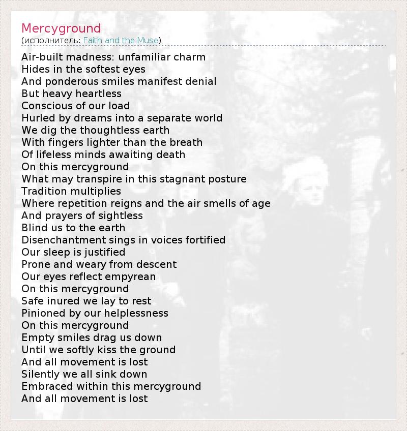 Это интересно:"Faith and the Muse" сформирована в 1994 году. Вокалист и автор текстов Monica Richards (прежде "Strange Boutique" и "Madhouse") и William Faith (прежде "Christian Death" и "Shadow Project"). Дуэт вытаскивает музыку из широкого массива стилей: gothic rock, ethereal, сeltic, post-punk, и даже jazz. Neo-pagan и Celtic проявили большое влияние на содержание лирики. Их звук существенно изменяется... продолжение