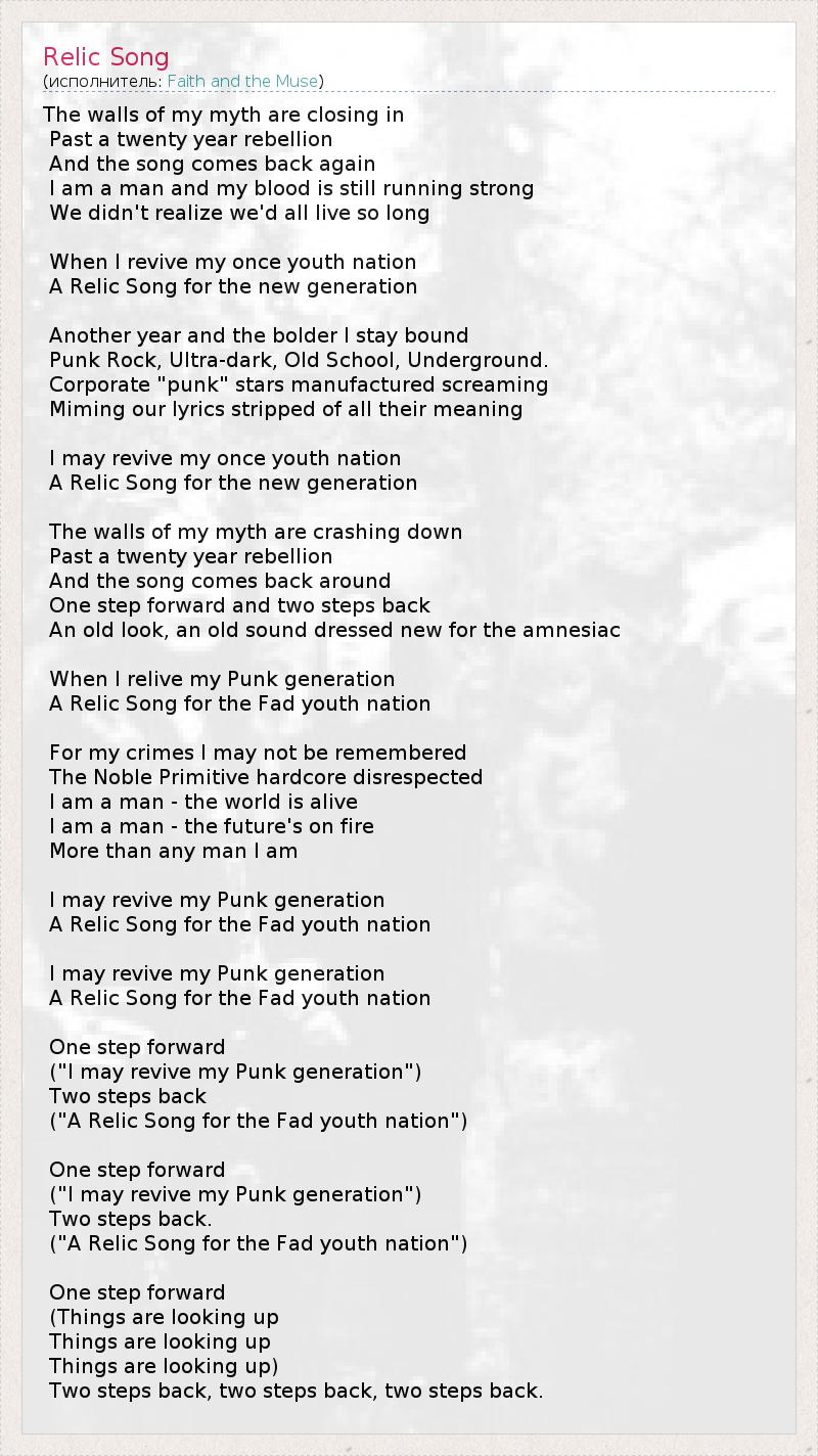 Стены моего мифа приближаются Прошлое двадцати лет восстания И песня вновь возвращается Я мужчина и моя кровь все еще работает сильная Мы не понимали, что мы все живем так долго Когда я возродить мою раз молодежный нацию Реликвия Песня для нового поколения Еще один год и смелее я останусь границу Панк-рок , Ультра- темно, Old School , метро . Корпоративный " панк" звезды изготовлены крик Miming наши тексты лишен всех их значения Я может возродить мою раз молодежный нацию Реликвия Песня для нового поколения Стены моего мифа рухнул Прошлое двадцати лет восстания И песня возвращается вокруг Один шаг вперед и два шага назад Старая взгляд , старый звук одет новый для страдающего амнезией Когда я вновь пережить мое поколение Punk Реликвия Песня для Причуды молодежной нации Для моих преступлений я не упоминались Благородный Примитивные хардкор уважают Я мужчина -мир живой Я мужчина - будущий в огне Больше, чем любой человек, которого я являюсь Я может возродить мое поколение Punk Реликвия Песня для Причуды молодежной нации Я может возродить мое поколение Punk Реликвия Песня для Причуды молодежной нации Один шаг вперед ( "Я , возможно, возродить мое поколение панк " ) Два шага назад ( "Реликвия Песня для причуда молодежной нации " ) Один шаг вперед ( "Я , возможно, возродить мое поколение панк " ) Два шага назад . ( "Реликвия Песня для причуда молодежной нации " ) Один шаг вперед ( Вещи смотрят вверх Положение улучшается Вещи смотрят вверх ) Два шага назад , два шага назад , два шага назад .