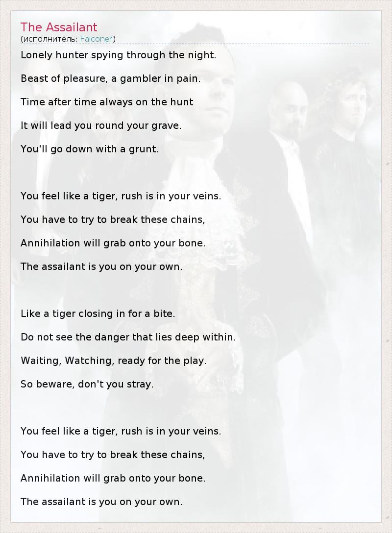 Lonely hunter spying through the night. Beast of pleasure, a gambler in pain. Time after time always on the hunt It will lead you round your grave. You'll go down with a grunt. You feel like a tiger, rush is in your veins. You have to try to break these chains, Annihilation will grab onto your bone. The assailant is you on your own. Like a tiger closing in for a bite. Do not see the danger that lies deep within. Waiting, Watching, ready for the play. So beware, don't you stray. You feel like a tiger, rush is in your veins. You have to try to break these chains, Annihilation will grab onto your bone. The assailant is you on your own.