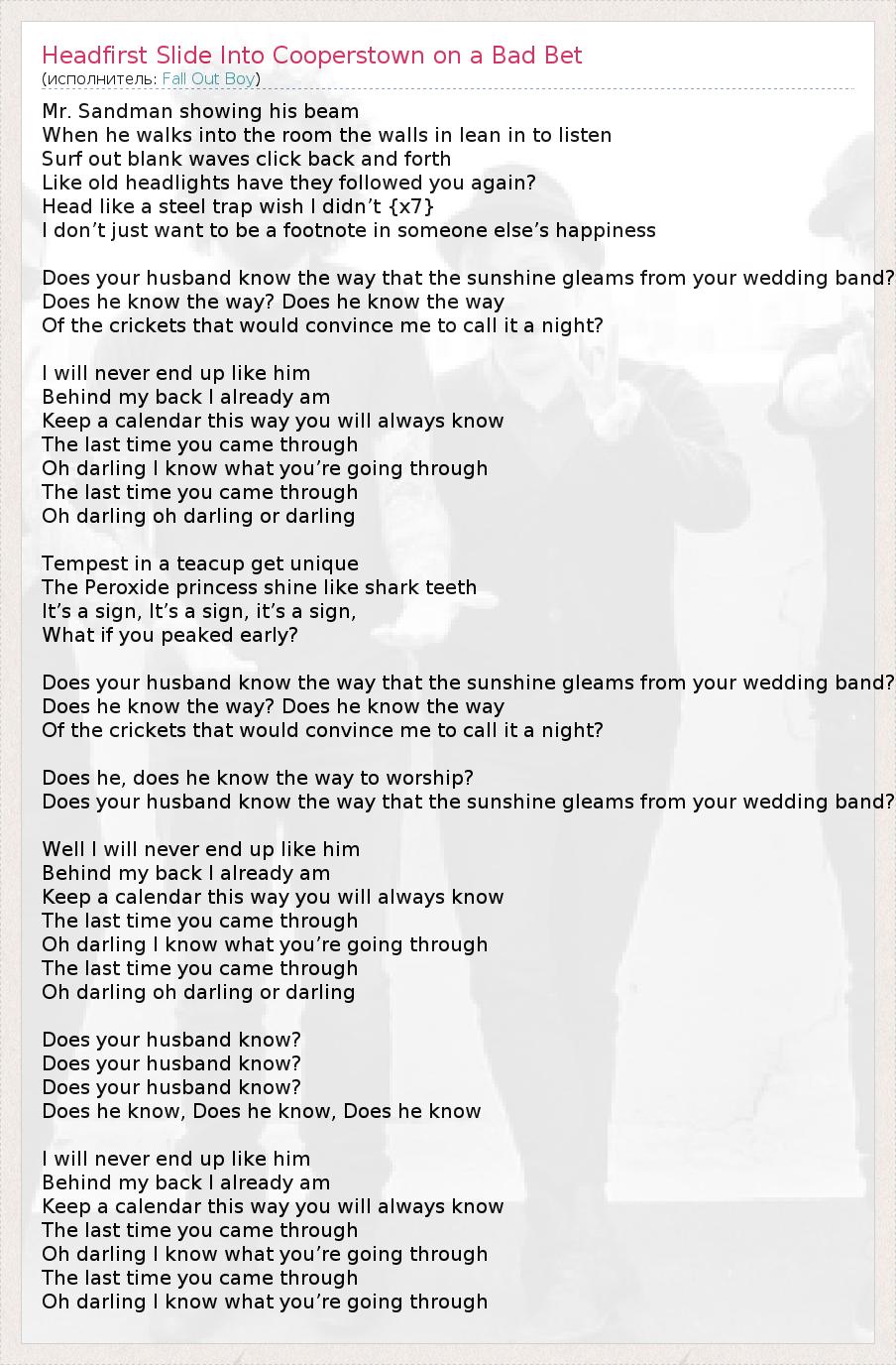ГлавнаяИсполнителиFall Out BoyHeadfirst Slide Into Cooperstown on a Bad Bet