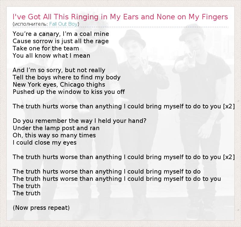 You’re a canary, I’m a coal mine Cause sorrow is just all the rage Take one for the team You all know what I mean And I’m so sorry, but not really Tell the boys where to find my body New York eyes, Chicago thighs Pushed up the window to kiss you off The truth hurts worse than anything I could bring myself to do to you [x2] Do you remember the way I held your hand? Under the lamp post and ran Oh, this way so many times I could close my eyes The truth hurts worse than anything I could bring myself to do to you [x2] The truth hurts worse than anything I could bring myself to do The truth hurts worse than anything I could bring myself to do to you The truth The truth (Now press repeat)