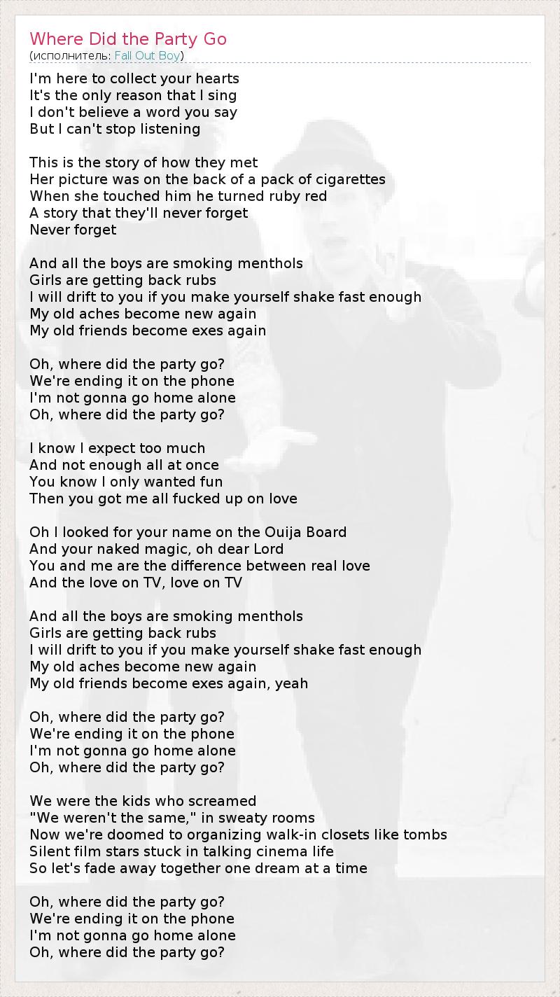 I'm here to collect your hearts It's the only reason that I sing I don't believe a word you say But I can't stop listening This is the story of how they met Her picture was on the back of a pack of cigarettes When she touched him he turned ruby red A story that they'll never forget Never forget And all the boys are smoking menthols Girls are getting back rubs I will drift to you if you make yourself shake fast enough My old aches become new again My old friends become exes again Oh, where did the party go? We're ending it on the phone I'm not gonna go home alone Oh, where did the party go? I know I expect too much And not enough all at once You know I only wanted fun Then you got me all fucked up on love Oh I looked for your name on the Ouija Board And your naked magic, oh dear Lord You and me are the difference between real love And the love on TV, love on TV And all the boys are smoking menthols Girls are getting back rubs I will drift to you if you make yourself shake fast enough My old aches become new again My old friends become exes again, yeah Oh, where did the party go? We're ending it on the phone I'm not gonna go home alone Oh, where did the party go? We were the kids who screamed "We weren't the same," in sweaty rooms Now we're doomed to organizing walk-in closets like tombs Silent film stars stuck in talking cinema life So let's fade away together one dream at a time Oh, where did the party go? We're ending it on the phone I'm not gonna go home alone Oh, where did the party go?