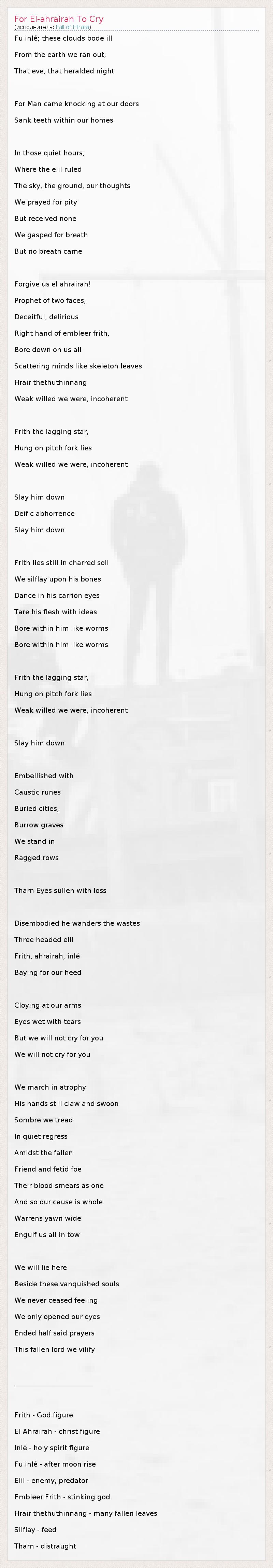 Fu inlé; these clouds bode ill From the earth we ran out; That eve, that heralded night For Man came knocking at our doors Sank teeth within our homes In those quiet hours, Where the elil ruled The sky, the ground, our thoughts We prayed for pity But received none We gasped for breath But no breath came Forgive us el ahrairah! Prophet of two faces; Deceitful, delirious Right hand of embleer frith, Bore down on us all Scattering minds like skeleton leaves Hrair thethuthinnang Weak willed we were, incoherent Frith the lagging star, Hung on pitch fork lies Weak willed we were, incoherent Slay him down Deific abhorrence Slay him down Frith lies still in charred soil We silflay upon his bones Dance in his carrion eyes Tare his flesh with ideas Bore within him like worms Bore within him like worms Frith the lagging star, Hung on pitch fork lies Weak willed we were, incoherent Slay him down Embellished with Caustic runes Buried cities, Burrow graves We stand in Ragged rows Tharn Eyes sullen with loss Disembodied he wanders the wastes Three headed elil Frith, ahrairah, inlé Baying for our heed Cloying at our arms Eyes wet with tears But we will not cry for you We will not cry for you We march in atrophy His hands still claw and swoon Sombre we tread In quiet regress Amidst the fallen Friend and fetid foe Their blood smears as one And so our cause is whole Warrens yawn wide Engulf us all in tow We will lie here Beside these vanquished souls We never ceased feeling We only opened our eyes Ended half said prayers This fallen lord we vilify _______________________ Frith - God figure El Ahrairah - christ figure Inlé - holy spirit figure Fu inlé - after moon rise Elil - enemy, predator Embleer Frith - stinking god Hrair thethuthinnang - many fallen leaves Silflay - feed Tharn - distraught