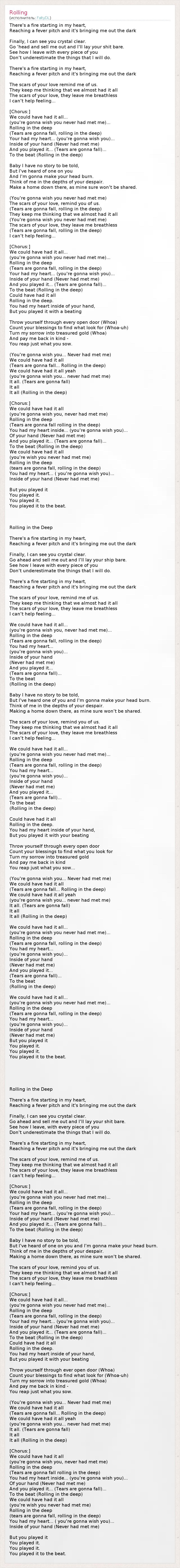 There's a fire starting in my heart, Reaching a fever pitch and it's bringing me out the dark Finally, I can see you crystal clear. Go 'head and sell me out and I'll lay your shit bare. See how I leave with every piece of you Don't underestimate the things that I will do. There's a fire starting in my heart, Reaching a fever pitch and it's bringing me out the dark The scars of your love remind me of us. They keep me thinking that we almost had it all The scars of your love, they leave me breathless I can't help feeling... [Chorus:] We could have had it all... (you're gonna wish you never had met me)... Rolling in the deep (Tears are gonna fall, rolling in the deep) Your had my heart... (you're gonna wish you)... Inside of your hand (Never had met me) And you played it... (Tears are gonna fall)... To the beat (Rolling in the deep) Baby I have no story to be told, But I've heard of one on you And I'm gonna make your head burn. Think of me in the depths of your despair. Make a home down there, as mine sure won't be shared. (You're gonna wish you never had met me) The scars of your love, remind you of us. (Tears are gonna fall, rolling in the deep) They keep me thinking that we almost had it all (You're gonna wish you never had met me) The scars of your love, they leave me breathless (Tears are gonna fall, rolling in the deep) I can't help feeling... [Chorus:] We could have had it all... (you're gonna wish you never had met me)... Rolling in the deep (Tears are gonna fall, rolling in the deep) Your had my heart... (you're gonna wish you)... Inside of your hand (Never had met me) And you played it... (Tears are gonna fall)... To the beat (Rolling in the deep) Could have had it all Rolling in the deep. You had my heart inside of your hand, But you played it with a beating Throw yourself through every open door (Whoa) Count your blessings to find what look for (Whoa-uh) Turn my sorrow into treasured gold (Whoa) And pay me back in kind - You reap just what you sow. (You're gonna wish you... Never had met me) We could have had it all (Tears are gonna fall... Rolling in the deep) We could have had it all yeah (you're gonna wish you... never had met me) It all. (Tears are gonna fall) It all It all (Rolling in the deep) [Chorus:] We could have had it all (you're gonna wish you, never had met me) Rolling in the deep (Tears are gonna fall rolling in the deep) You had my heart inside... (you're gonna wish you)... Of your hand (Never had met me) And you played it... (Tears are gonna fall)... To the beat (Rolling in the deep) We could have had it all (you're wish you never had met me) Rolling in the deep (tears are gonna fall, rolling in the deep) You had my heart... ( you're gonna wish you)... Inside of your hand (Never had met me) But you played it You played it. You played it. You played it to the beat. Rolling in the Deep There's a fire starting in my heart, Reaching a fever pitch and it's bringing me out the dark Finally, I can see you crystal clear. Go ahead and sell me out and I'll lay your ship bare. See how I leave with every piece of you Don't underestimate the things that I will do. There's a fire starting in my heart, Reaching a fever pitch and it's bringing me out the dark The scars of your love, remind me of us. They keep me thinking that we almost had it all The scars of your love, they leave me breathless I can't help feeling... We could have had it all... (you're gonna wish you, never had met me)... Rolling in the deep (Tears are gonna fall, rolling in the deep) You had my heart... (you're gonna wish you)... Inside of your hand (Never had met me) And you played it... (Tears are gonna fall)... To the beat (Rolling in the deep) Baby I have no story to be told, But I've heard one of you and I'm gonna make your head burn. Think of me in the depths of your despair. Making a home down there, as mine sure won't be shared. The scars of your love, remind you of us. They keep me thinking that we almost had it all The scars of your love, they leave me breathless I can't help feeling... We could have had it all... (you're gonna wish you never had met me)... Rolling in the deep (Tears are gonna fall, rolling in the deep) You had my heart... (you're gonna wish you)... Inside of your hand (Never had met me) And you played it... (Tears are gonna fall)... To the beat (Rolling in the deep) Could have had it all Rolling in the deep. You had my heart inside of your hand, But you played it with your beating Throw yourself through every open door Count your blessings to find what you look for Turn my sorrow into treasured gold And pay me back in kind You reap just what you sow... (You're gonna wish you... Never had met me) We could have had it all (Tears are gonna fall... Rolling in the deep) We could have had it all yeah (you're gonna wish you... never had met me) It all. (Tears are gonna fall) It all It all (Rolling in the deep) We could have had it all... (you're gonna wish you never had met me)... Rolling in the deep (Tears are gonna fall, rolling in the deep) You had my heart... (you're gonna wish you)... Inside of your hand (Never had met me) And you played it... (Tears are gonna fall)... To the beat (Rolling in the deep) We could have had it all... (you're gonna wish you never had met me)... Rolling in the deep (Tears are gonna fall, rolling in the deep) You had my heart... (you're gonna wish you)... Inside of your hand (Never had met me) But you played it You played it. You played it. You played it to the beat. Rolling in the Deep There's a fire starting in my heart, Reaching a fever pitch and it's bringing me out the dark Finally, I can see you crystal clear. Go ahead and sell me out and I'll lay your shit bare. See how I leave, with every piece of you Don't underestimate the things that I will do. There's a fire starting in my heart, Reaching a fever pitch and it's bringing me out the dark The scars of your love, remind me of us. They keep me thinking that we almost had it all The scars of your love