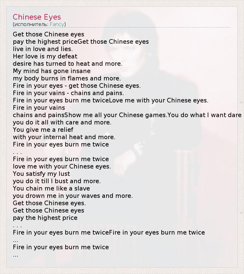 Fire in your eyes burn me twiceLove me with your Chinese eyes.