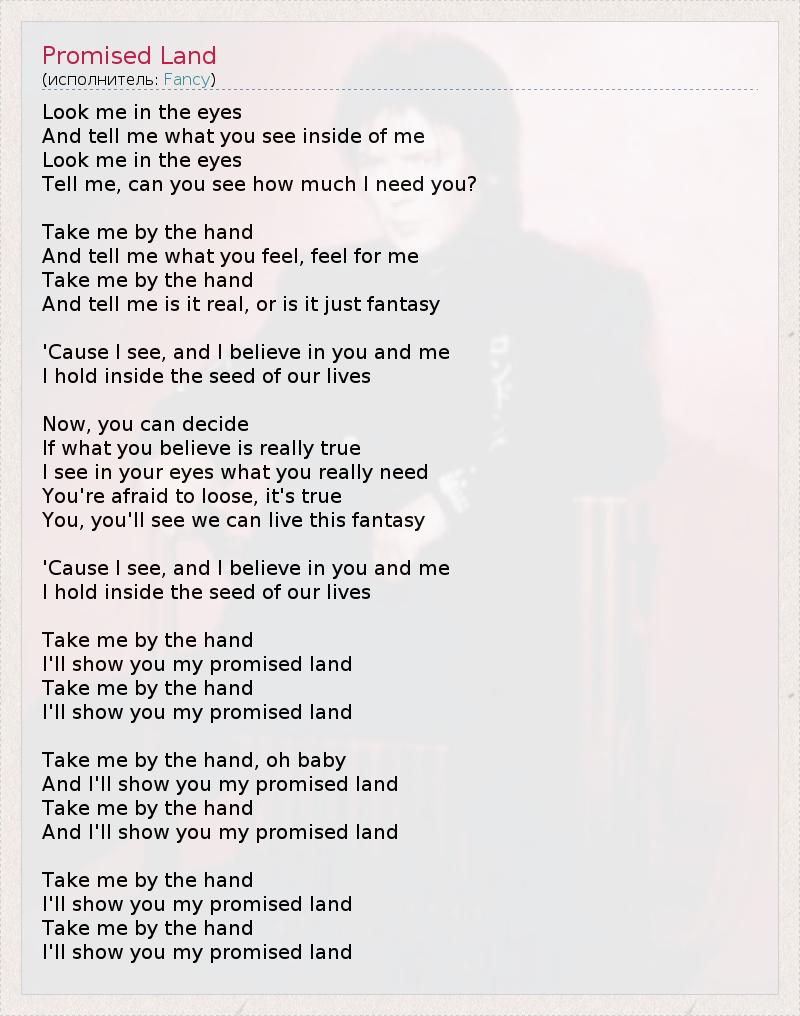 Посмотри мне в глаза И скажи мне, что видишь во мне Посмотри мне в глаза Скажи мне, видишь ли ты, как сильно мне нужна? Возьми меня за руку И скажи мне, что ты чувствуешь Возьми меня за руку И скажи мне, всё это реально или просто фантазия? Потому что я вижу и верю в нас Я храню внутри семя наших жизней Теперь, ты можешь решить Является ли правдой то, во что ты веришь Я вижу в твоих глазах, что тебе действительно нужно Ты боишься своих желаний, это - правда Ты поймешь, что мы можем жить в этой фантазии Потому что я вижу и верю в нас Я храню внутри семя наших жизней Возьми меня за руку Я покажу тебе свою землю обетованную Возьми меня за руку Я покажу тебе свою землю обетованную Возьми меня за руку, о, малышка И я покажу тебе свою землю обетованную Возьми меня за руку И я покажу тебе свою землю обетованную Возьми меня за руку Я покажу тебе свою землю обетованную Возьми меня за руку Я покажу тебе свою землю обетованную