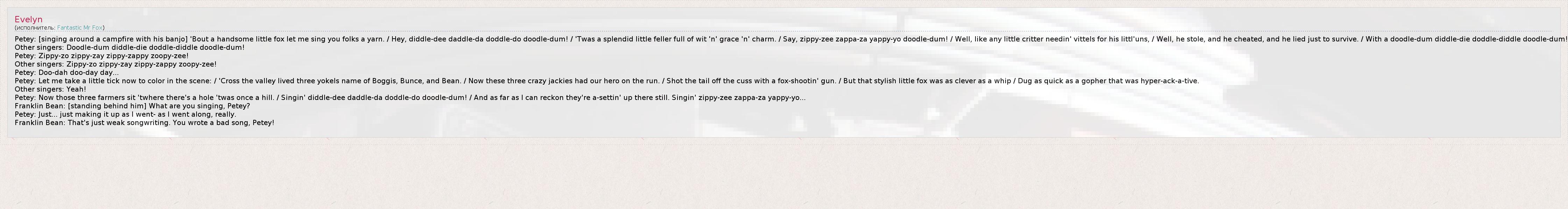 Petey: [singing around a campfire with his banjo] 'Bout a handsome little fox let me sing you folks a yarn. / Hey, diddle-dee daddle-da doddle-do doodle-dum! / 'Twas a splendid little feller full of wit 'n' grace 'n' charm. / Say, zippy-zee zappa-za yappy-yo doodle-dum! / Well, like any little critter needin' vittels for his littl'uns, / Well, he stole, and he cheated, and he lied just to survive. / With a doodle-dum diddle-die doddle-diddle doodle-dum!