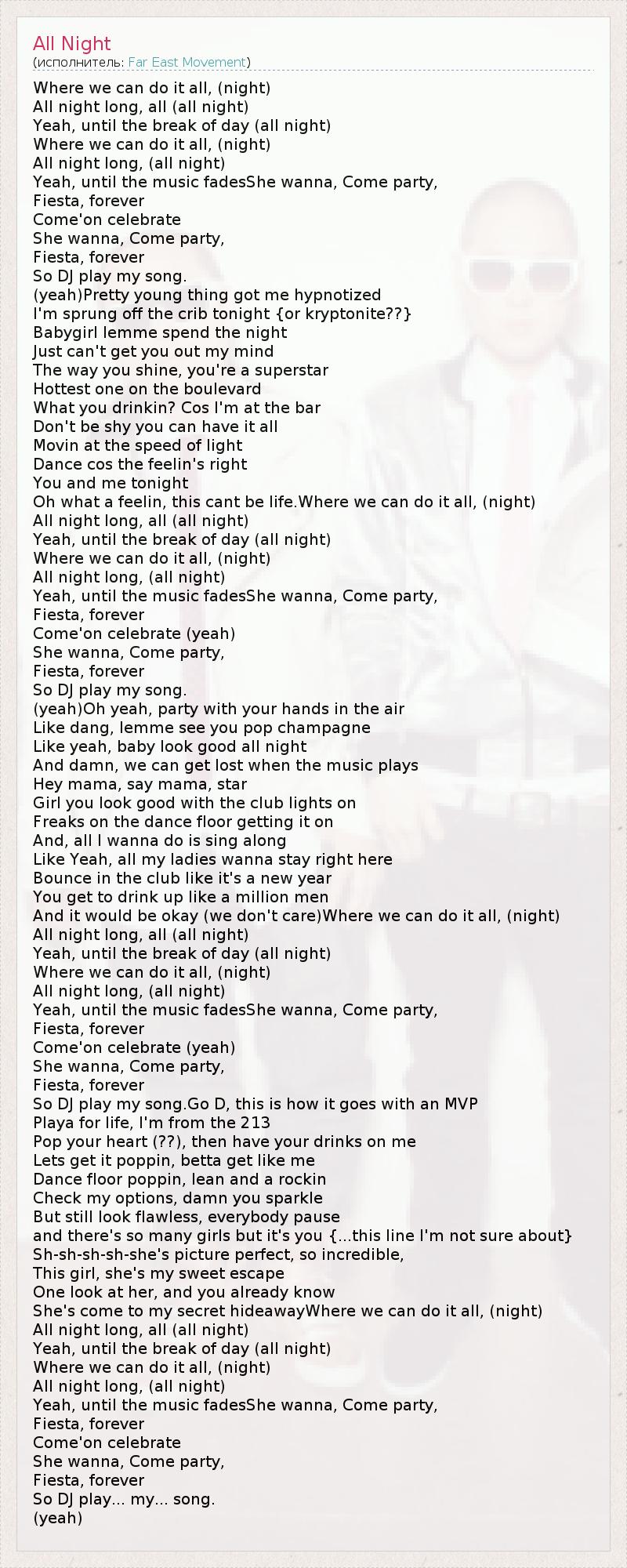 Это интересно:Far East Movement - это группа рэпперов, композиторов, организаторов музыкальных евентов, которая образовалась в 2003 году в Лос Анджелес, Калифорния. Участники группы: Кев Ниш, Прогресс, Джэй-Сплиф и ДиДже Вирман. Они решили бабахнуть впервые мультикультурный евент в Лос Анджелесе, чтобы помочь центру реабилитации наркозависимых. Их программа была названа "Movementality". В начале 2006 года «Far... продолжение