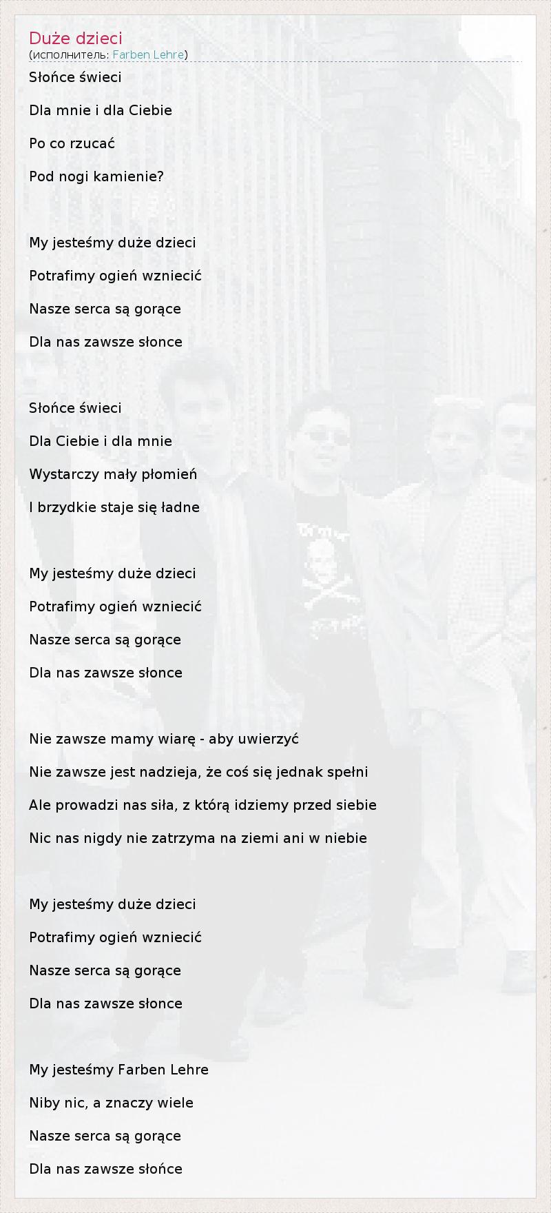 Это интересно:Farben Lehre - Польская панк-группа, основанная в 1986 году Войтехом Войда (Wojciech Wojda). 21 октября 1986 года группа отыграла свой первый концерт в городе Plock. В 1990 группа стала призером Рок Фестиваля Jarocin. Первый альбом группы, Bez Pokory был выпущен в 1991 году. Они весьма успешны на местной и международной панк рок сценах. В 2004 году Fabren Lehre организовал Punky Reggae Live фестиваль.