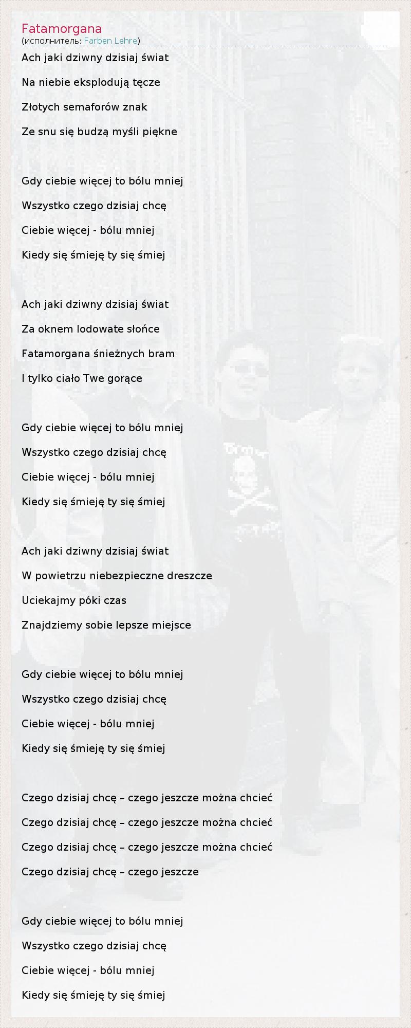 Это интересно:Farben Lehre - Польская панк-группа, основанная в 1986 году Войтехом Войда (Wojciech Wojda). 21 октября 1986 года группа отыграла свой первый концерт в городе Plock. В 1990 группа стала призером Рок Фестиваля Jarocin. Первый альбом группы, Bez Pokory был выпущен в 1991 году. Они весьма успешны на местной и международной панк рок сценах. В 2004 году Fabren Lehre организовал Punky Reggae Live фестиваль.