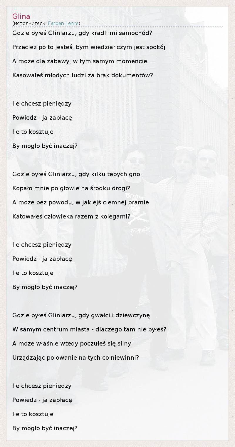 Это интересно:Farben Lehre - Польская панк-группа, основанная в 1986 году Войтехом Войда (Wojciech Wojda). 21 октября 1986 года группа отыграла свой первый концерт в городе Plock. В 1990 группа стала призером Рок Фестиваля Jarocin. Первый альбом группы, Bez Pokory был выпущен в 1991 году. Они весьма успешны на местной и международной панк рок сценах. В 2004 году Fabren Lehre организовал Punky Reggae Live фестиваль.