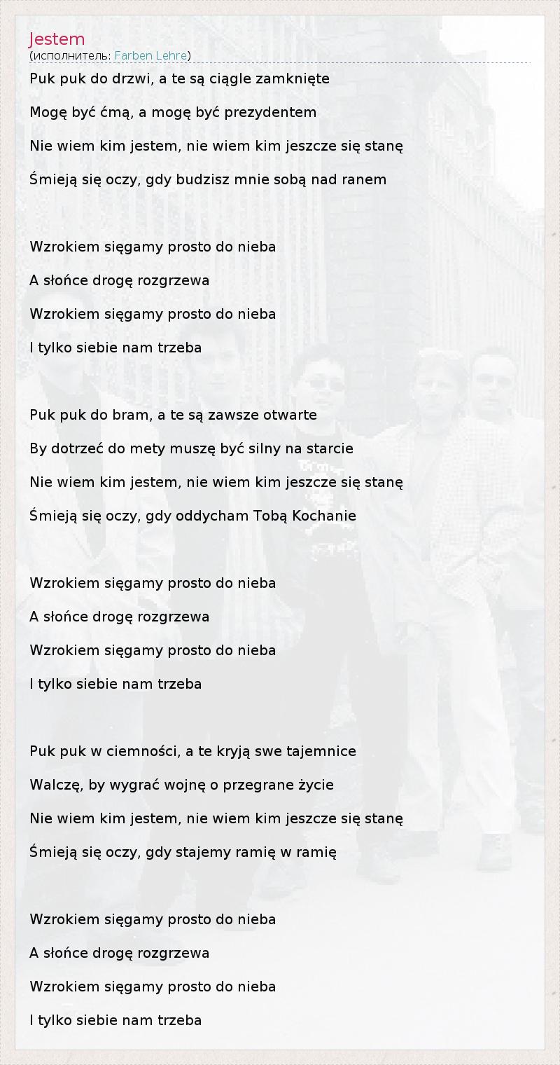 Это интересно:Farben Lehre - Польская панк-группа, основанная в 1986 году Войтехом Войда (Wojciech Wojda). 21 октября 1986 года группа отыграла свой первый концерт в городе Plock. В 1990 группа стала призером Рок Фестиваля Jarocin. Первый альбом группы, Bez Pokory был выпущен в 1991 году. Они весьма успешны на местной и международной панк рок сценах. В 2004 году Fabren Lehre организовал Punky Reggae Live фестиваль.