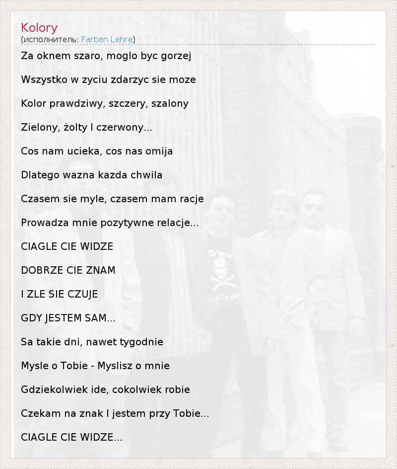 Это интересно:Farben Lehre - Польская панк-группа, основанная в 1986 году Войтехом Войда (Wojciech Wojda). 21 октября 1986 года группа отыграла свой первый концерт в городе Plock. В 1990 группа стала призером Рок Фестиваля Jarocin. Первый альбом группы, Bez Pokory был выпущен в 1991 году. Они весьма успешны на местной и международной панк рок сценах. В 2004 году Fabren Lehre организовал Punky Reggae Live фестиваль.