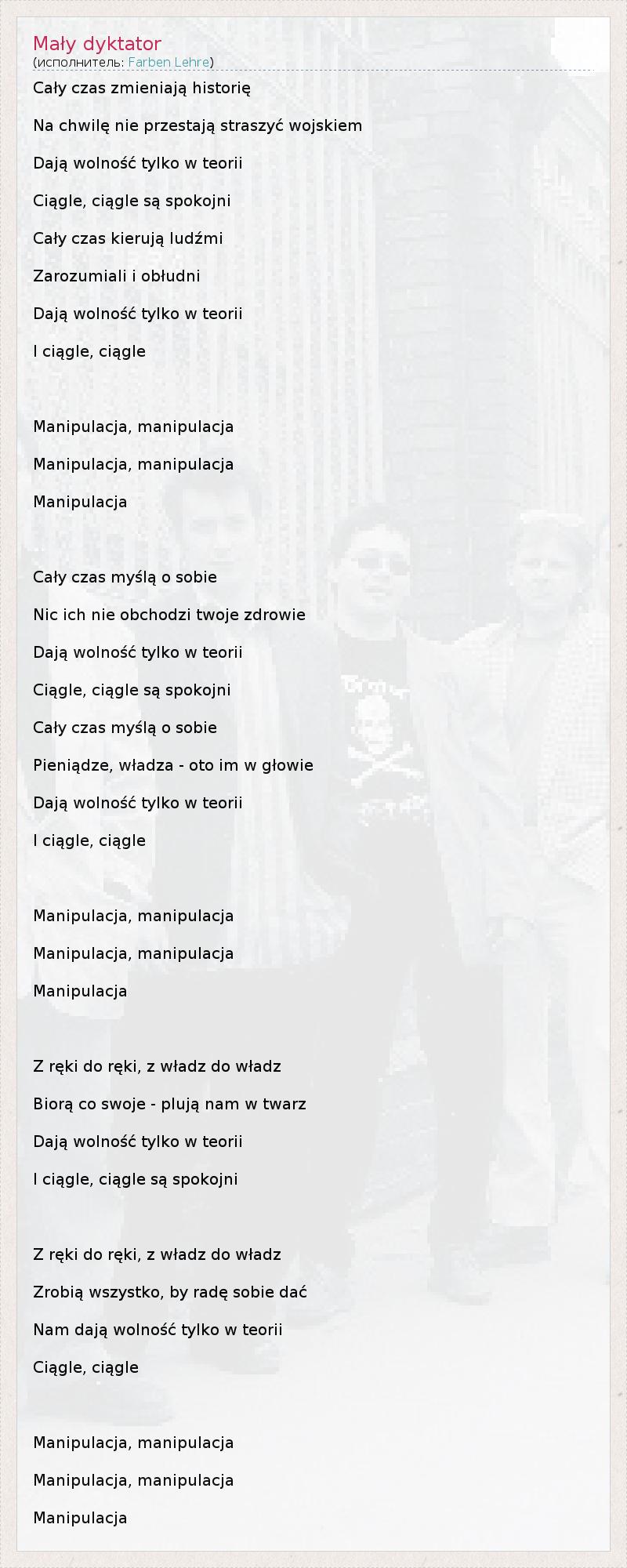 Это интересно:Farben Lehre - Польская панк-группа, основанная в 1986 году Войтехом Войда (Wojciech Wojda). 21 октября 1986 года группа отыграла свой первый концерт в городе Plock. В 1990 группа стала призером Рок Фестиваля Jarocin. Первый альбом группы, Bez Pokory был выпущен в 1991 году. Они весьма успешны на местной и международной панк рок сценах. В 2004 году Fabren Lehre организовал Punky Reggae Live фестиваль.