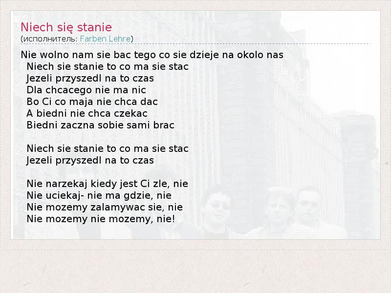 Nie wolno nam sie bac tego co sie dzieje na okolo nas Niech sie stanie to co ma sie stac Jezeli przyszedl na to czas Dla chcacego nie ma nic Bo Ci co maja nie chca dac A biedni nie chca czekac Biedni zaczna sobie sami brac Niech sie stanie to co ma sie stac Jezeli przyszedl na to czas Nie narzekaj kiedy jest Ci zle, nie Nie uciekaj- nie ma gdzie, nie Nie mozemy zalamywac sie, nie Nie mozemy nie mozemy, nie!