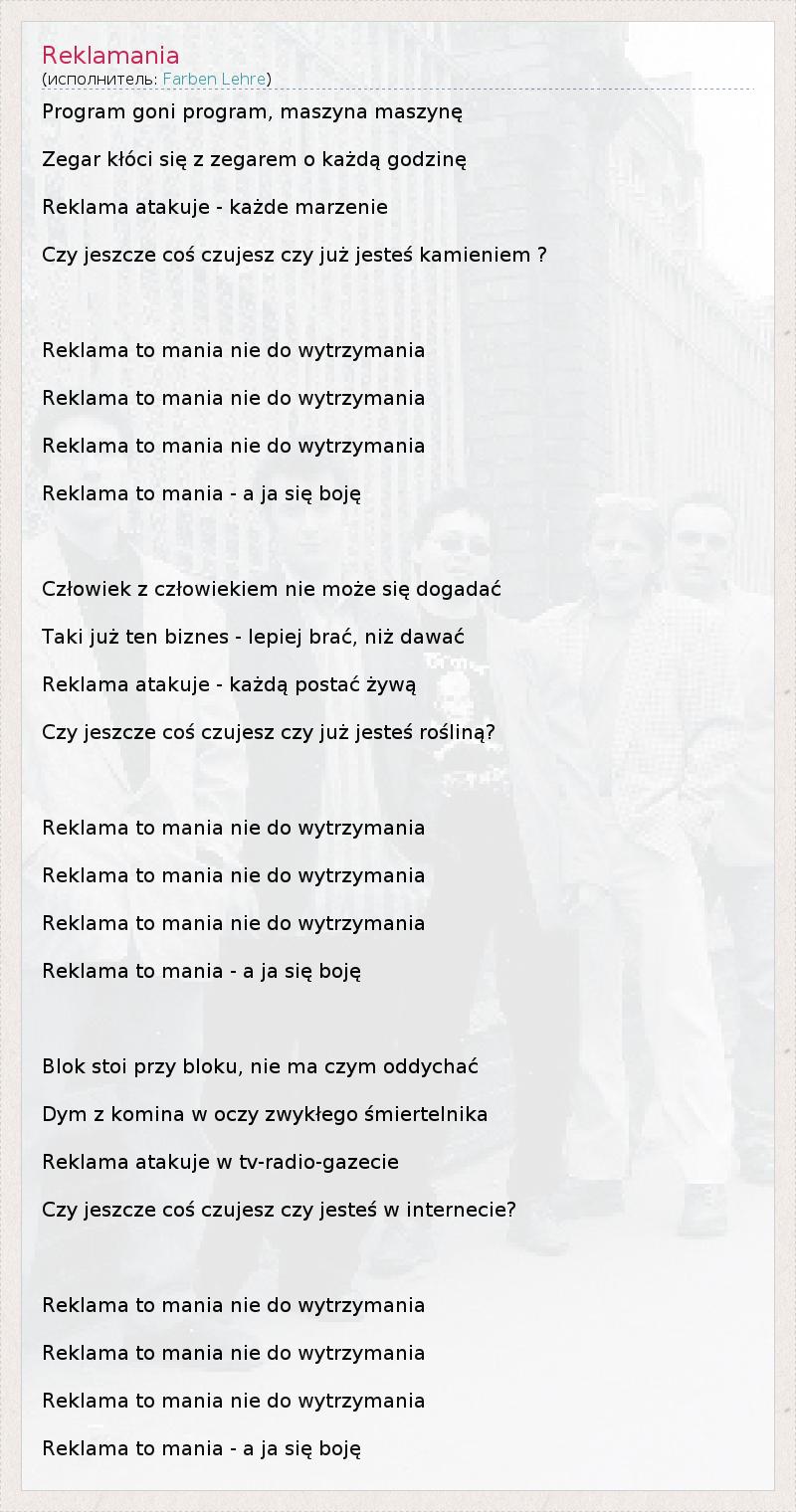 Это интересно:Farben Lehre - Польская панк-группа, основанная в 1986 году Войтехом Войда (Wojciech Wojda). 21 октября 1986 года группа отыграла свой первый концерт в городе Plock. В 1990 группа стала призером Рок Фестиваля Jarocin. Первый альбом группы, Bez Pokory был выпущен в 1991 году. Они весьма успешны на местной и международной панк рок сценах. В 2004 году Fabren Lehre организовал Punky Reggae Live фестиваль.
