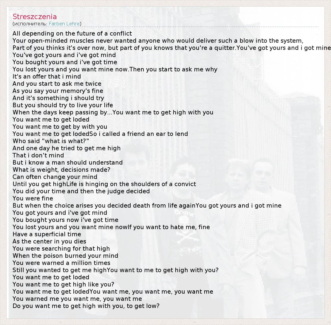 Это интересно:Farben Lehre - Польская панк-группа, основанная в 1986 году Войтехом Войда (Wojciech Wojda). 21 октября 1986 года группа отыграла свой первый концерт в городе Plock. В 1990 группа стала призером Рок Фестиваля Jarocin. Первый альбом группы, Bez Pokory был выпущен в 1991 году. Они весьма успешны на местной и международной панк рок сценах. В 2004 году Fabren Lehre организовал Punky Reggae Live фестиваль.