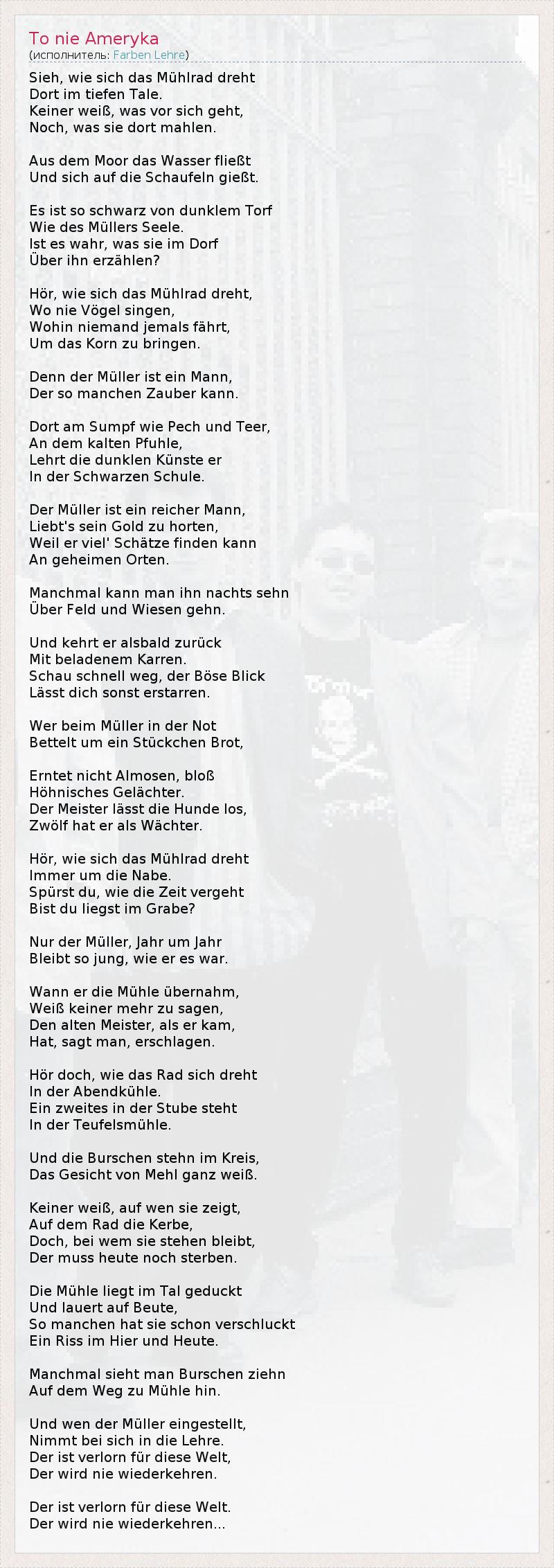 Это интересно:Farben Lehre - Польская панк-группа, основанная в 1986 году Войтехом Войда (Wojciech Wojda). 21 октября 1986 года группа отыграла свой первый концерт в городе Plock. В 1990 группа стала призером Рок Фестиваля Jarocin. Первый альбом группы, Bez Pokory был выпущен в 1991 году. Они весьма успешны на местной и международной панк рок сценах. В 2004 году Fabren Lehre организовал Punky Reggae Live фестиваль.