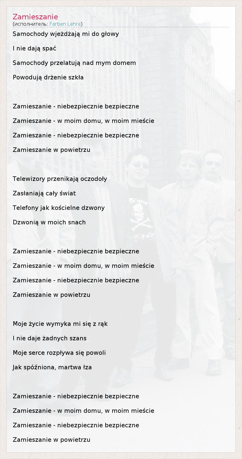 Это интересно:Farben Lehre - Польская панк-группа, основанная в 1986 году Войтехом Войда (Wojciech Wojda). 21 октября 1986 года группа отыграла свой первый концерт в городе Plock. В 1990 группа стала призером Рок Фестиваля Jarocin. Первый альбом группы, Bez Pokory был выпущен в 1991 году. Они весьма успешны на местной и международной панк рок сценах. В 2004 году Fabren Lehre организовал Punky Reggae Live фестиваль.