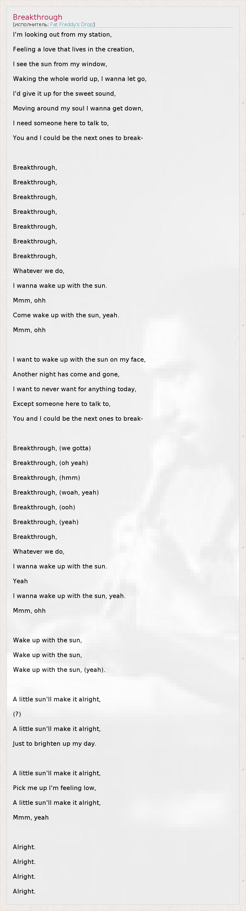 I'm looking out from my station, Feeling a love that lives in the creation, I see the sun from my window, Waking the whole world up, I wanna let go, I'd give it up for the sweet sound, Moving around my soul I wanna get down, I need someone here to talk to, You and I could be the next ones to break- Breakthrough, Breakthrough, Breakthrough, Breakthrough, Breakthrough, Breakthrough, Breakthrough, Whatever we do, I wanna wake up with the sun. Mmm, ohh Come wake up with the sun, yeah. Mmm, ohh I want to wake up with the sun on my face, Another night has come and gone, I want to never want for anything today, Except someone here to talk to, You and I could be the next ones to break- Breakthrough, (we gotta) Breakthrough, (oh yeah) Breakthrough, (hmm) Breakthrough, (woah, yeah) Breakthrough, (ooh) Breakthrough, (yeah) Breakthrough, Whatever we do, I wanna wake up with the sun. Yeah I wanna wake up with the sun, yeah. Mmm, ohh Wake up with the sun, Wake up with the sun, Wake up with the sun, (yeah). A little sun'll make it alright, (?) A little sun'll make it alright, Just to brighten up my day. A little sun'll make it alright, Pick me up I'm feeling low, A little sun'll make it alright, Mmm, yeah Alright. Alright. Alright. Alright.