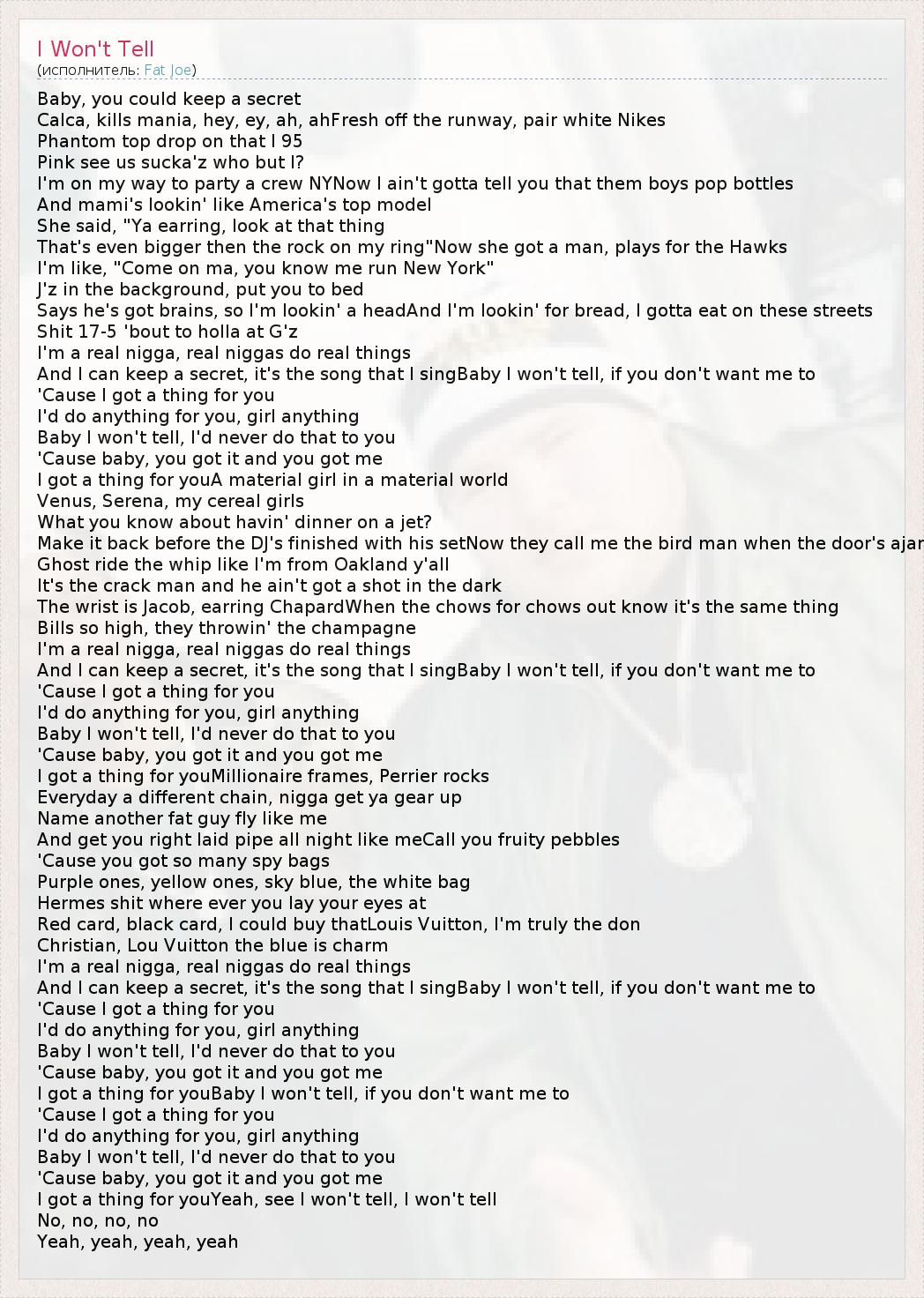 Baby, you could keep a secret Calca, kills mania, hey, ey, ah, ahFresh off the runway, pair white Nikes Phantom top drop on that I 95 Pink see us sucka'z who but I? I'm on my way to party a crew NYNow I ain't gotta tell you that them boys pop bottles And mami's lookin' like America's top model She said, "Ya earring, look at that thing That's even bigger then the rock on my ring"Now she got a man, plays for the Hawks I'm like, "Come on ma, you know me run New York" J'z in the background, put you to bed Says he's got brains, so I'm lookin' a headAnd I'm lookin' for bread, I gotta eat on these streets Shit 17-5 'bout to holla at G'z I'm a real nigga, real niggas do real things And I can keep a secret, it's the song that I singBaby I won't tell, if you don't want me to 'Cause I got a thing for you I'd do anything for you, girl anything Baby I won't tell, I'd never do that to you 'Cause baby, you got it and you got me I got a thing for youA material girl in a material world Venus, Serena, my cereal girls What you know about havin' dinner on a jet? Make it back before the DJ's finished with his setNow they call me the bird man when the door's ajar Ghost ride the whip like I'm from Oakland y'all It's the crack man and he ain't got a shot in the dark The wrist is Jacob, earring ChapardWhen the chows for chows out know it's the same thing Bills so high, they throwin' the champagne I'm a real nigga, real niggas do real things And I can keep a secret, it's the song that I singBaby I won't tell, if you don't want me to 'Cause I got a thing for you I'd do anything for you, girl anything Baby I won't tell, I'd never do that to you 'Cause baby, you got it and you got me I got a thing for youMillionaire frames, Perrier rocks Everyday a different chain, nigga get ya gear up Name another fat guy fly like me And get you right laid pipe all night like meCall you fruity pebbles 'Cause you got so many spy bags Purple ones, yellow ones, sky blue, the white bag Hermes shit where ever you lay your eyes at Red card, black card, I could buy thatLouis Vuitton, I'm truly the don Christian, Lou Vuitton the blue is charm I'm a real nigga, real niggas do real things And I can keep a secret, it's the song that I singBaby I won't tell, if you don't want me to 'Cause I got a thing for you I'd do anything for you, girl anything Baby I won't tell, I'd never do that to you 'Cause baby, you got it and you got me I got a thing for youBaby I won't tell, if you don't want me to 'Cause I got a thing for you I'd do anything for you, girl anything Baby I won't tell, I'd never do that to you 'Cause baby, you got it and you got me I got a thing for youYeah, see I won't tell, I won't tell No, no, no, no Yeah, yeah, yeah, yeah