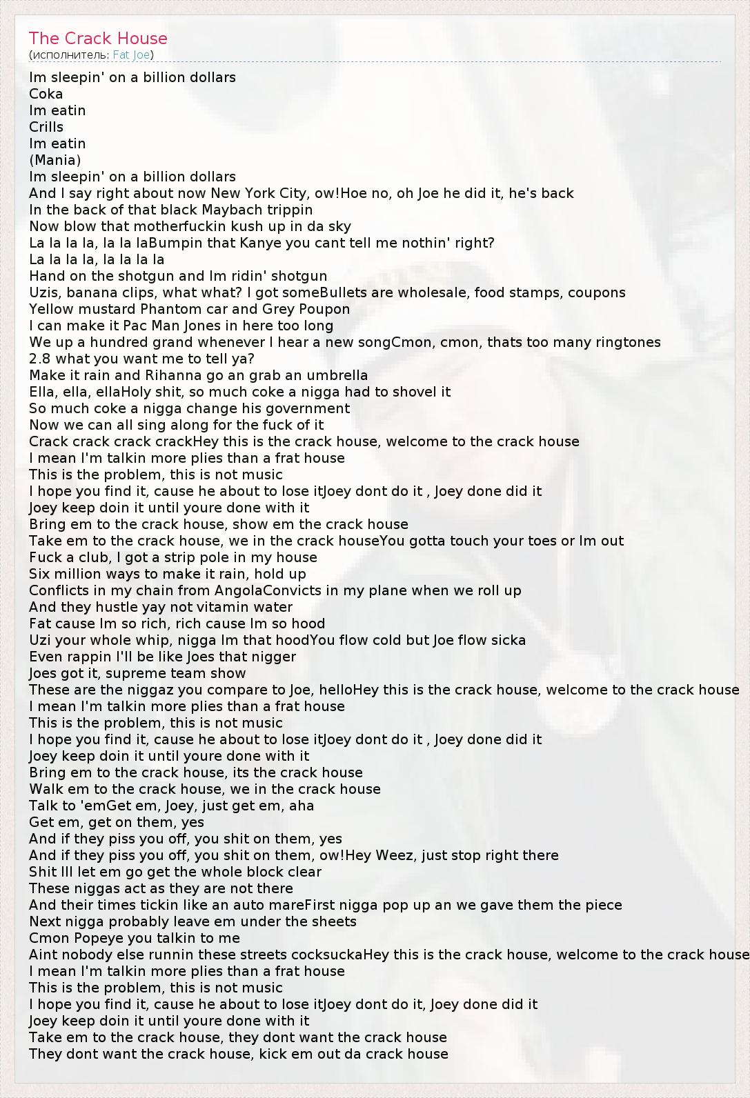 These are the niggaz you compare to Joe, helloHey this is the crack house, welcome to the crack house