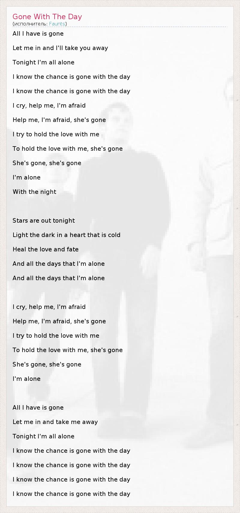 All I have is gone Let me in and I'll take you away Tonight I'm all alone I know the chance is gone with the day I know the chance is gone with the day I cry, help me, I'm afraid Help me, I'm afraid, she's gone I try to hold the love with me To hold the love with me, she's gone She's gone, she's gone I'm alone With the night Stars are out tonight Light the dark in a heart that is cold Heal the love and fate And all the days that I'm alone And all the days that I'm alone I cry, help me, I'm afraid Help me, I'm afraid, she's gone I try to hold the love with me To hold the love with me, she's gone She's gone, she's gone I'm alone All I have is gone Let me in and take me away Tonight I'm all alone I know the chance is gone with the day I know the chance is gone with the day I know the chance is gone with the day I know the chance is gone with the day