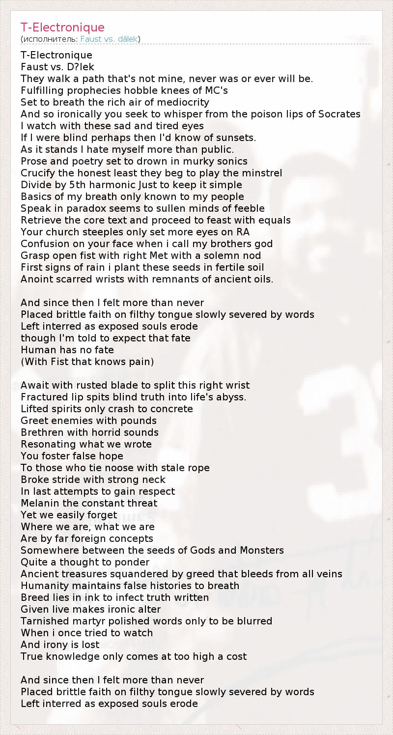 T-Electronique Faust vs. D?lek They walk a path that's not mine, never was or ever will be. Fulfilling prophecies hobble knees of MC's Set to breath the rich air of mediocrity And so ironically you seek to whisper from the poison lips of Socrates I watch with these sad and tired eyes If I were blind perhaps then I'd know of sunsets. As it stands I hate myself more than public. Prose and poetry set to drown in murky sonics Crucify the honest least they beg to play the minstrel Divide by 5th harmonic Just to keep it simple Basics of my breath only known to my people Speak in paradox seems to sullen minds of feeble Retrieve the core text and proceed to feast with equals Your church steeples only set more eyes on RA Confusion on your face when i call my brothers god Grasp open fist with right Met with a solemn nod First signs of rain i plant these seeds in fertile soil Anoint scarred wrists with remnants of ancient oils. And since then I felt more than never Placed brittle faith on filthy tongue slowly severed by words Left interred as exposed souls erode though I'm told to expect that fate Human has no fate (With Fist that knows pain) Await with rusted blade to split this right wrist Fractured lip spits blind truth into life's abyss. Lifted spirits only crash to concrete Greet enemies with pounds Brethren with horrid sounds Resonating what we wrote You foster false hope To those who tie noose with stale rope Broke stride with strong neck In last attempts to gain respect Melanin the constant threat Yet we easily forget Where we are, what we are Are by far foreign concepts Somewhere between the seeds of Gods and Monsters Quite a thought to ponder Ancient treasures squandered by greed that bleeds from all veins Humanity maintains false histories to breath Breed lies in ink to infect truth written Given live makes ironic alter Tarnished martyr polished words only to be blurred When i once tried to watch And irony is lost True knowledge only comes at too high a cost And since then I felt more than never Placed brittle faith on filthy tongue slowly severed by words Left interred as exposed souls erode