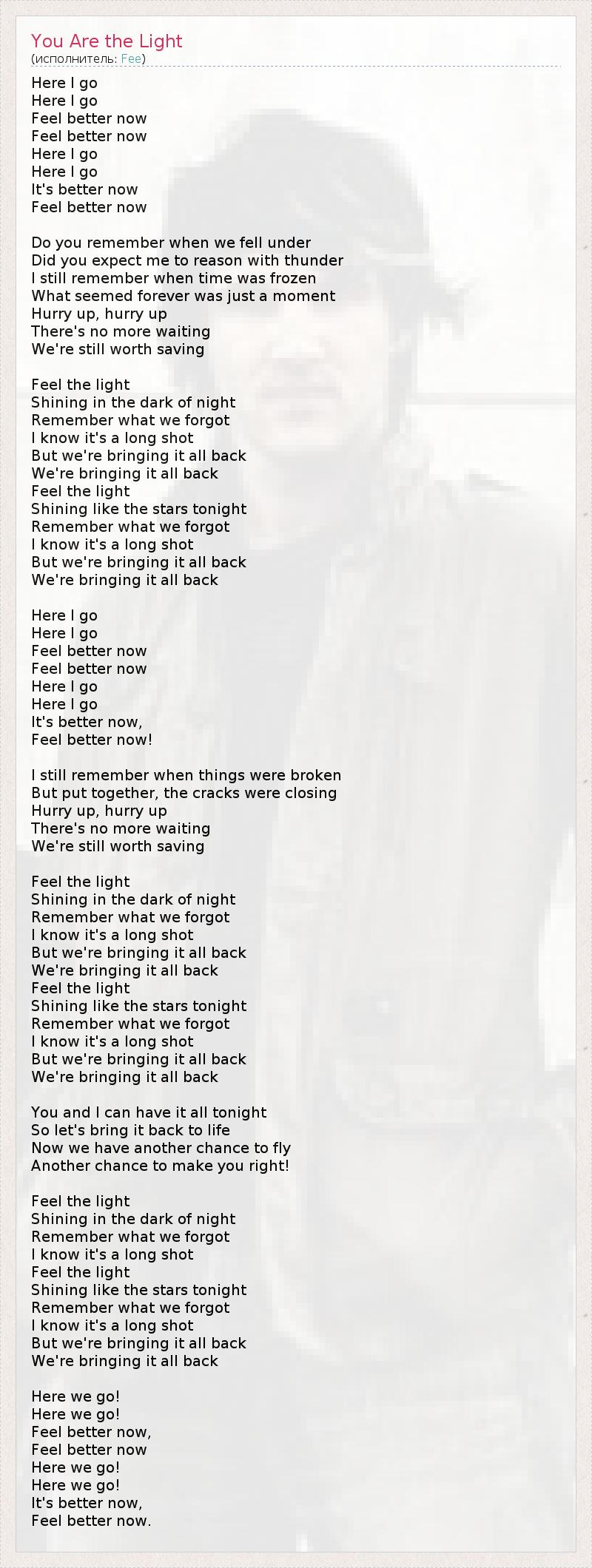Вот и я, Вот и я. Сейчас мне лучше, Сейчас мне лучше. Вот и я, Вот и я. Стало лучше, Сейчас мне лучше! Ты помнишь, как мы попали под дождь? Ты ждал, что я буду договариваться с громом? Я до сих пор помню, когда время будто остановилось. То, что казалось навсегда, было просто мгновением. Скорее, скорее, Больше не надо ждать, Нас все ещё можно спасти. Почувствуй свет, Сияющий в ночной темноте, Вспомни, что мы забыли. Я знаю, было много всего, Но мы вернём то, что было, Мы вернём то, что было. Почувствуй свет, Сияющий словно звёзды ночью. Вспомни, что мы забыли. Я знаю было много всего, Но мы вернём то, что было, Мы вернём то, что было. > Вот и я, Вот и я. Сейчас мне лучше, Сейчас мне лучше. Вот и я, Вот и я. Стало лучше, Сейчас мне лучше! Я до сих пор помню то, что мы разрушили Но вместе мы сможем всё восстановить Скорее, скорее Больше не надо ждать Нас все ещё можно спасти. Почувствуй свет, Сияющий в ночной темноте, Вспомни, что мы забыли. Я знаю, было много всего, Но мы вернём то, что было, Мы вернём то, что было. Почувствуй свет, Сияющий словно звёзды ночью. Вспомни, что мы забыли. Я знаю было много всего, Но мы вернём то, что было, Мы вернём то, что было. Сегодня ночью у нас с тобой всё может случиться, Так давай вернём к жизни то, что было. Теперь у нас есть ещё один шанс воспарить, Ещё один шанс для тебя исправиться. Почувствуй свет, Сияющий в ночной темноте, Вспомни, что мы забыли. Я знаю, было много всего, Но мы вернём то, что было, Мы вернём то, что было. Почувствуй свет, Сияющий словно звёзды ночью. Вспомни, что мы забыли. Я знаю было много всего, Но мы вернём то, что было, Мы вернём то, что было. Вот и я, Вот и я. Сейчас мне лучше, Сейчас мне лучше. Вот и я, Вот и я. Стало лучше, Сейчас мне лучше!