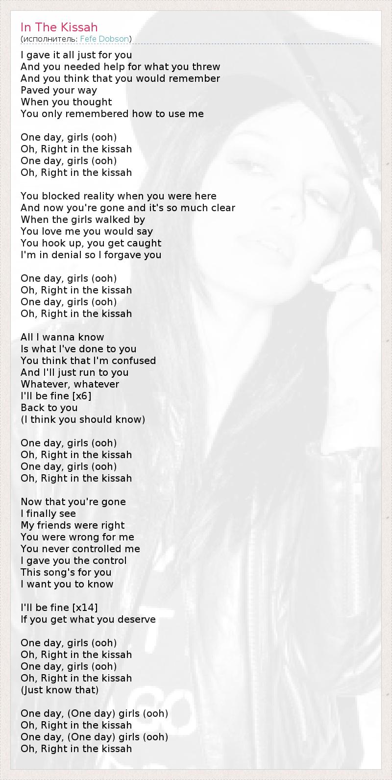 I gave it all just for you And you needed help for what you threw And you think that you would remember Paved your way When you thought You only remembered how to use me One day, girls (ooh) Oh, Right in the kissah One day, girls (ooh) Oh, Right in the kissah You blocked reality when you were here And now you're gone and it's so much clear When the girls walked by You love me you would say You hook up, you get caught I'm in denial so I forgave you One day, girls (ooh) Oh, Right in the kissah One day, girls (ooh) Oh, Right in the kissah All I wanna know Is what I've done to you You think that I'm confused And I'll just run to you Whatever, whatever I'll be fine [x6] Back to you (I think you should know) One day, girls (ooh) Oh, Right in the kissah One day, girls (ooh) Oh, Right in the kissah Now that you're gone I finally see My friends were right You were wrong for me You never controlled me I gave you the control This song's for you I want you to know I'll be fine [x14] If you get what you deserve One day, girls (ooh) Oh, Right in the kissah One day, girls (ooh) Oh, Right in the kissah (Just know that) One day, (One day) girls (ooh) Oh, Right in the kissah One day, (One day) girls (ooh) Oh, Right in the kissah