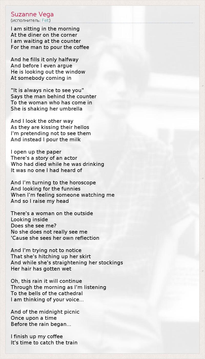 А как ты думаешь, о чем песня "Suzanne Vega" ?