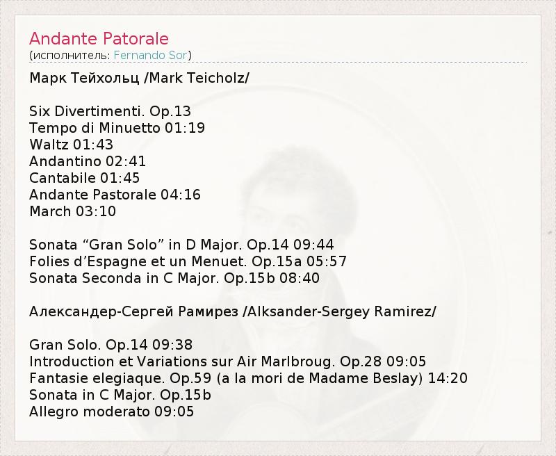 Это интересно:Фернандо Сор (1778 - 1839) - Испанский гитарист и композитор. Родился в Барселоне. В Испании его иногда называют "Бетховеном гитары". Первоначально игре на гитаре учился у своего отца. Музыкальное образование получил в католическом монастыре, где состоял певчим. По политическим мотивам Сор вынужден был покинуть Испанию, но его музыкальные занятия не прошли даром. Фернандо Сор был... продолжение
