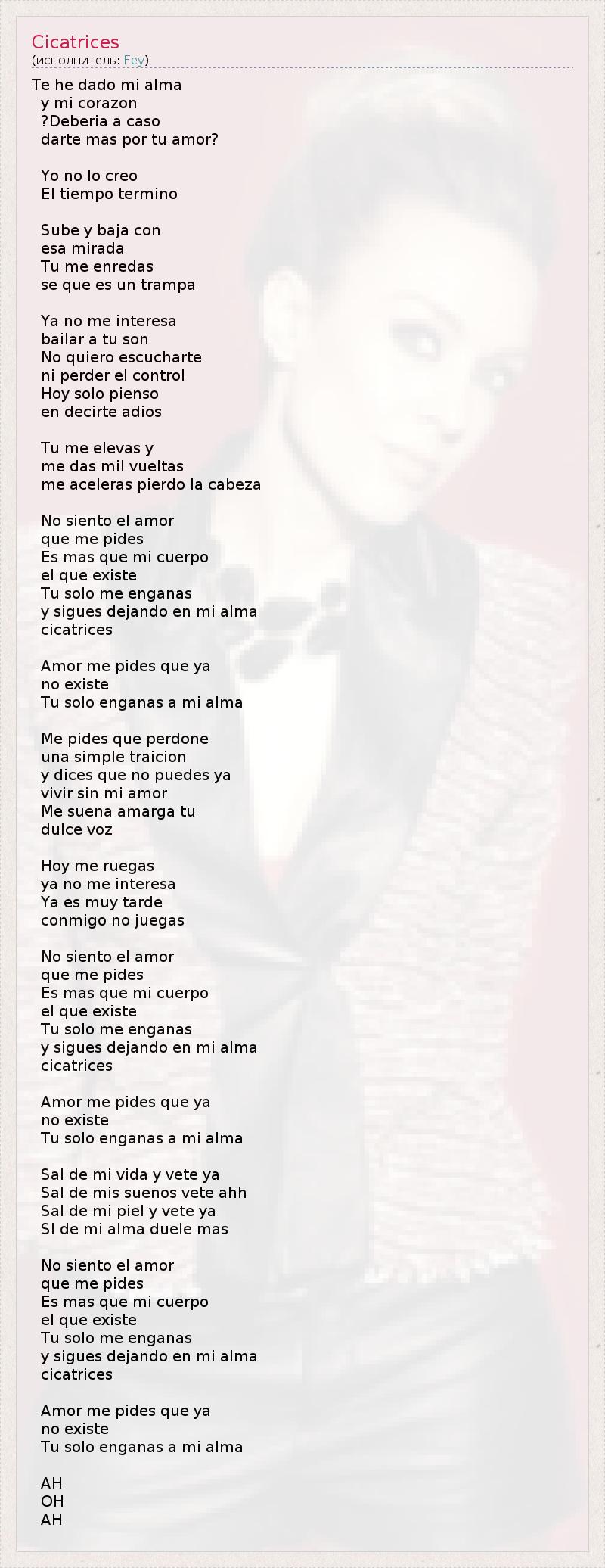 Te he dado mi alma y mi corazon ?Deberia a caso darte mas por tu amor? Yo no lo creo El tiempo termino Sube y baja con esa mirada Tu me enredas se que es un trampa Ya no me interesa bailar a tu son No quiero escucharte ni perder el control Hoy solo pienso en decirte adios Tu me elevas y me das mil vueltas me aceleras pierdo la cabeza No siento el amor que me pides Es mas que mi cuerpo el que existe Tu solo me enganas y sigues dejando en mi alma cicatrices Amor me pides que ya no existe Tu solo enganas a mi alma Me pides que perdone una simple traicion y dices que no puedes ya vivir sin mi amor Me suena amarga tu dulce voz Hoy me ruegas ya no me interesa Ya es muy tarde conmigo no juegas No siento el amor que me pides Es mas que mi cuerpo el que existe Tu solo me enganas y sigues dejando en mi alma cicatrices Amor me pides que ya no existe Tu solo enganas a mi alma Sal de mi vida y vete ya Sal de mis suenos vete ahh Sal de mi piel y vete ya Sl de mi alma duele mas No siento el amor que me pides Es mas que mi cuerpo el que existe Tu solo me enganas y sigues dejando en mi alma cicatrices Amor me pides que ya no existe Tu solo enganas a mi alma AH OH AH