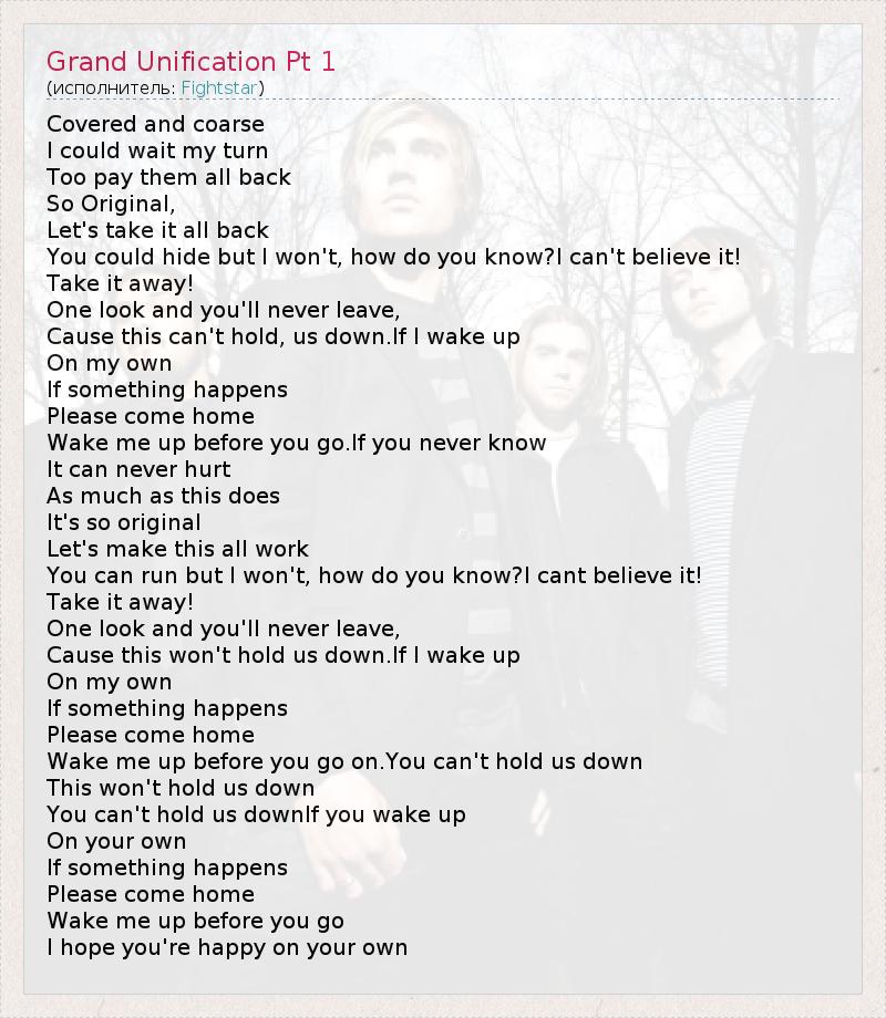 Covered and coarse I could wait my turn Too pay them all back So Original, Let's take it all back You could hide but I won't, how do you know?I can't believe it! Take it away! One look and you'll never leave, Cause this can't hold, us down.If I wake up On my own If something happens Please come home Wake me up before you go.If you never know It can never hurt As much as this does It's so original Let's make this all work You can run but I won't, how do you know?I cant believe it! Take it away! One look and you'll never leave, Cause this won't hold us down.If I wake up On my own If something happens Please come home Wake me up before you go on.You can't hold us down This won't hold us down You can't hold us downIf you wake up On your own If something happens Please come home Wake me up before you go I hope you're happy on your own