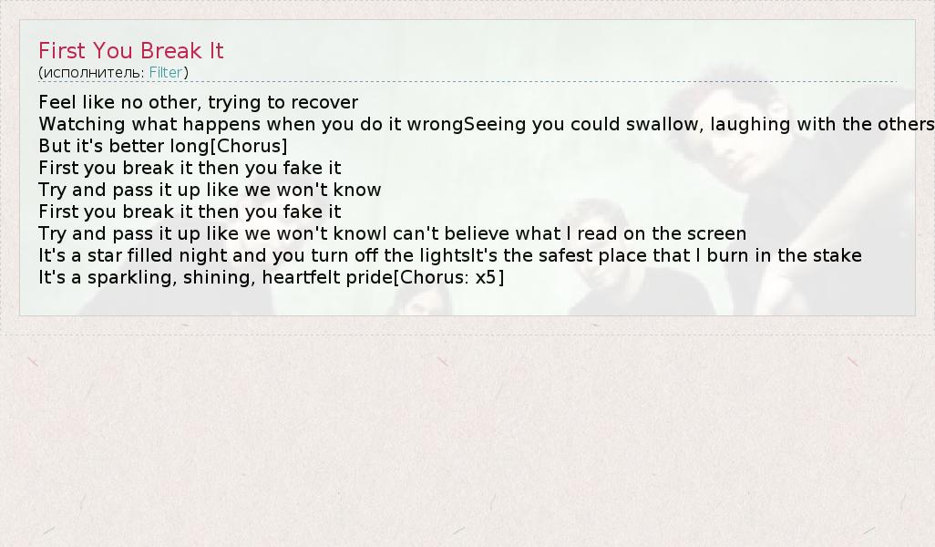 Это интересно:Американский индастриал-проект "Filter" появился на свет в виде дуэта: Брайан Лайзгэнг (программинг, гитара, клавишные, ударные) и Ричард Патрик (вокал, гитара, бас, программинг, ударные), игравший в свое время в Nine Inch Nails. Пока Патрик проводил эксперименты в восьмидорожечной студии в своем родном Кливленде, Лэйзгэнг получал философскую степень в чикагском университете и параллельно... продолжение