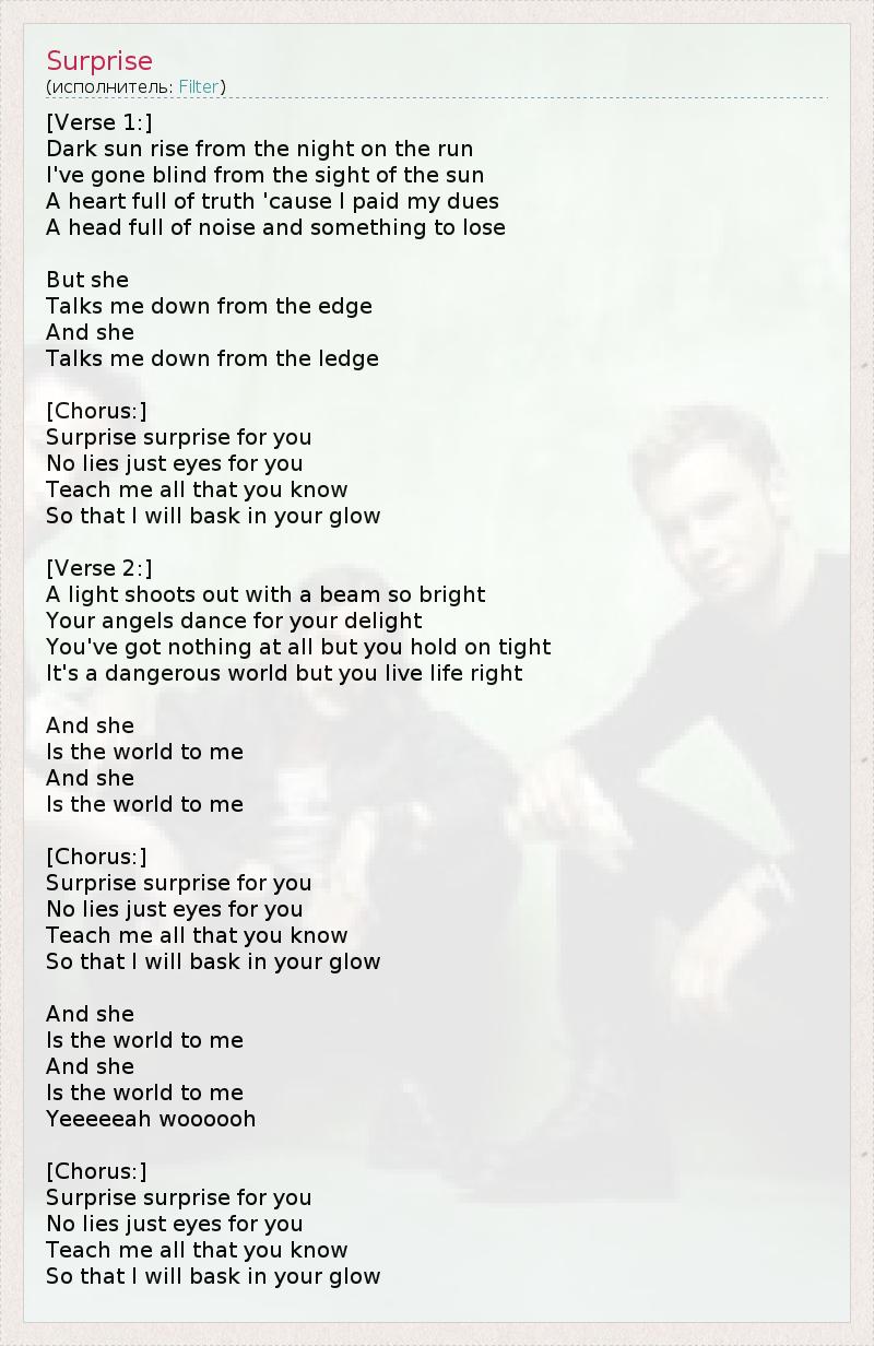 [Куплет 1:] Темное солнце встает в ночи второпях, Я ослеп, когда глянул на него. Мое сердце полно правды, потому что я заплатил по счетам, 1 Моя голова полна шума и того, что можно потерять. Но она Уговаривает меня отойти от края. Она Уговаривает меня отойти от обрыва. [Припев:] Сюрприз, сюрприз для тебя. Никакой лжи, лишь взгляд, обращенный к тебе. Научи меня всему, что знаешь, Чтобы я купался в твоём сиянии. [Куплет 2:] Свет расходится яркими лучами. К твоему восторгу твои ангелы танцуют. У тебя ничего нет, но ты крепко держишься, Это опасный мир, но ты живешь правильно. И она - Целый мир для меня, И она - Целый мир для меня. [Припев] Сюрприз, сюрприз для тебя. Никакой лжи, лишь взгляд, обращенный к тебе. Научи меня всему, что знаешь, Чтобы я купался в твоём сиянии. И она - Целый мир для меня, И она - Целый мир для меня, Да. [Припев] Сюрприз, сюрприз для тебя. Никакой лжи, лишь взгляд, обращенный к тебе. Научи меня всему, что знаешь, Чтобы я купался в твоём сиянии. 1 - дословно: по долгам