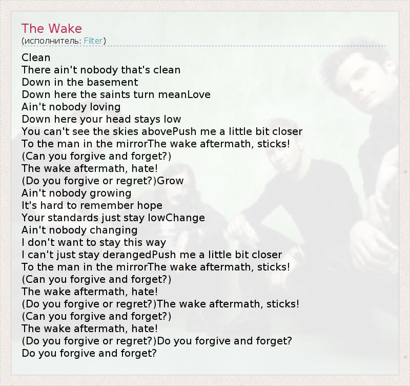 Clean There ain't nobody that's clean Down in the basement Down here the saints turn meanLove Ain't nobody loving Down here your head stays low You can't see the skies abovePush me a little bit closer To the man in the mirrorThe wake aftermath, sticks! (Can you forgive and forget?) The wake aftermath, hate! (Do you forgive or regret?)Grow Ain't nobody growing It's hard to remember hope Your standards just stay lowChange Ain't nobody changing I don't want to stay this way I can't just stay derangedPush me a little bit closer To the man in the mirrorThe wake aftermath, sticks! (Can you forgive and forget?) The wake aftermath, hate! (Do you forgive or regret?)The wake aftermath, sticks! (Can you forgive and forget?) The wake aftermath, hate! (Do you forgive or regret?)Do you forgive and forget? Do you forgive and forget?