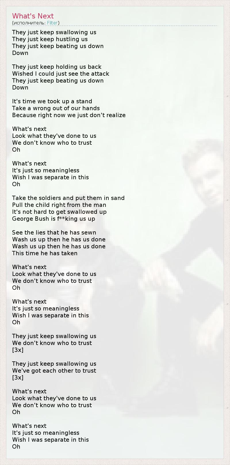They just keep swallowing us They just keep hustling us They just keep beating us down Down They just keep holding us back Wished I could just see the attack They just keep beating us down Down It's time we took up a stand Take a wrong out of our hands Because right now we just don't realize What's next Look what they've done to us We don't know who to trust Oh What's next It's just so meaningless Wish I was separate in this Oh Take the soldiers and put them in sand Pull the child right from the man It's not hard to get swallowed up George Bush is f**king us up See the lies that he has sewn Wash us up then he has us done Wash us up then he has us done This time he has taken What's next Look what they've done to us We don't know who to trust Oh What's next It's just so meaningless Wish I was separate in this Oh They just keep swallowing us We don't know who to trust [3x] They just keep swallowing us We've got each other to trust [3x] What's next Look what they've done to us We don't know who to trust Oh What's next It's just so meaningless Wish I was separate in this Oh