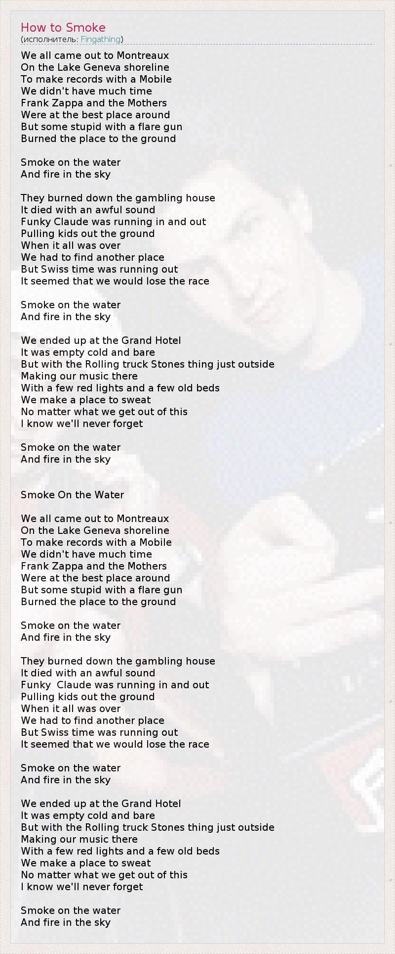 Мы прибыли в Монтре, На берег Женевского Озера, Чтобы записать в мобильной студии пластинку. Времени было немного, Фрэнк Заппа и «Мамаши» Занимали лучшие места в округе, Но глупец с ракетницей Все сжег дотла. Дым над водой И огонь в небесах Они сожгли дотла игорный дом, Он погибал с ужасным звуком, Фанки Клод метался туда и обратно, Вызволяя детей из опасной зоны. Когда все было кончено, Нам пришлось искать другое место, Но время пребывания в Швейцарии было на исходе, Казалось, мы не выиграем эту гонку. Дым над водой И огонь в небесах Мы осели в Гранд Отеле, Он был пуст, холоден и беден, Но когда «Роллинги» предоставили нам «Стоунскую» передвижку, Мы записали новую пластинку, При скудном свете красных фонарей на паре старых коек Мы изрядно попотели, Не важно, что у нас из этого получилось, Я знаю, мы никогда не забудем Дым над водой И огонь в небесах Дым по воде* (перевод Олег Митрофанов из Пензы) Мы все в Монтре припёрлись, На Лейк-Женевский берег, В "мобилке" зарекордить Пластинку побыстрее. Frank Zappa и The Mothers Здесь лучше всех засели, Но идиот с сигналкой Дотла спалил округу. Дым над водою - пламя в небесах... Дым над водою... Горело казино под общий хаос, Погибнув с жутким воем, Фанки Клод вокруг метался, Таща детей из опасной зоны. Когда закончился кошмар, Пришлось искать другое место, Но швейцарское время кончалось, А в гонке мы - ни с места! Дым над водою - пламя в небесах... Дым над водою... И мы засели в Гранд Отеле, В пустом, холодном, бедном, Но с переходом от "Rolling Stones", Мы записать альбом сумели, При скудном свете на паре коек Изрядно попотели... Не помню, что там вышло, Но не забуду в жизни Дым над водою - пламя в небесах... Дым над водою... * поэтический (эквиритмический) перевод